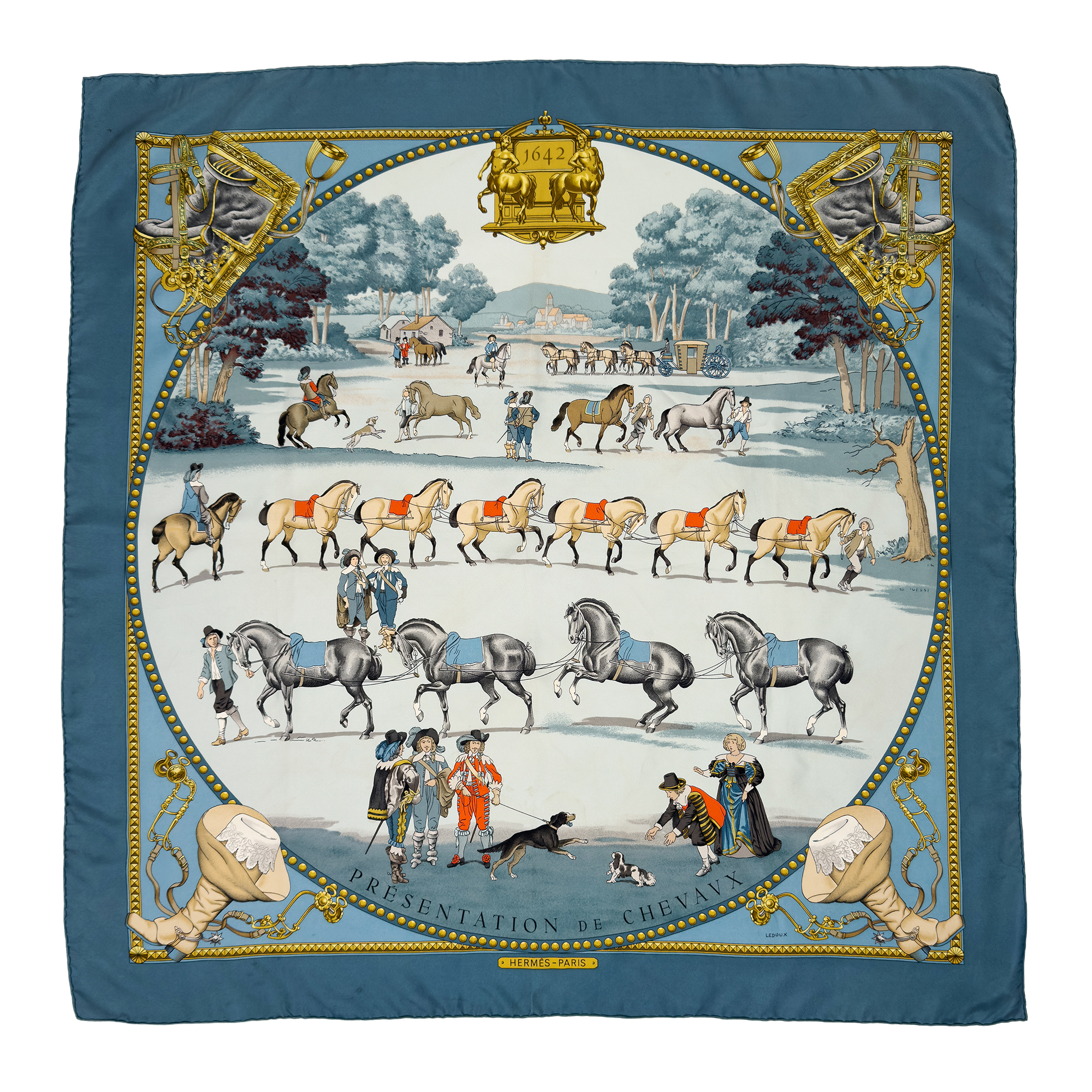 Présentation des Chevaux, carré in seta a stampa policroma su disegno di Philippe Ledoux del 1970, cm. 90x90 circa