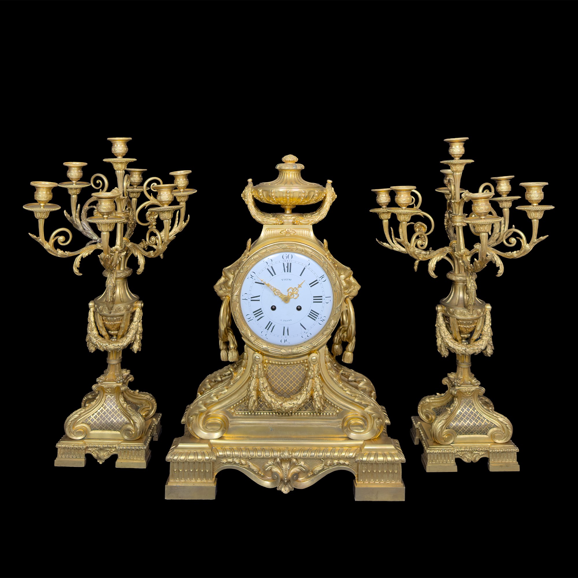 composto da una pendola e da una coppia di flambeaux. La pendola con quadrante circolare in smalto bianco e indici in numeri romani a doppio foro di carica, firmato Tagini ร Dijon; cassa a lira qualificata superiormente da un elemento vasiforme e ai lati da un mascherone leonino che trattiene un drappo ad anello con terminale a nappa. I flambeaux a sette luci cesellati con i medesimi ornati decorativi arricchiti da ghirlande di lauro e altri elementi similari, la pendola: h. cm. 68; i flambeaux: h. cm. 70,5 (la pendola mancante dei vetri anteriore e posteriore completa di chiave di carica; da revisionare)