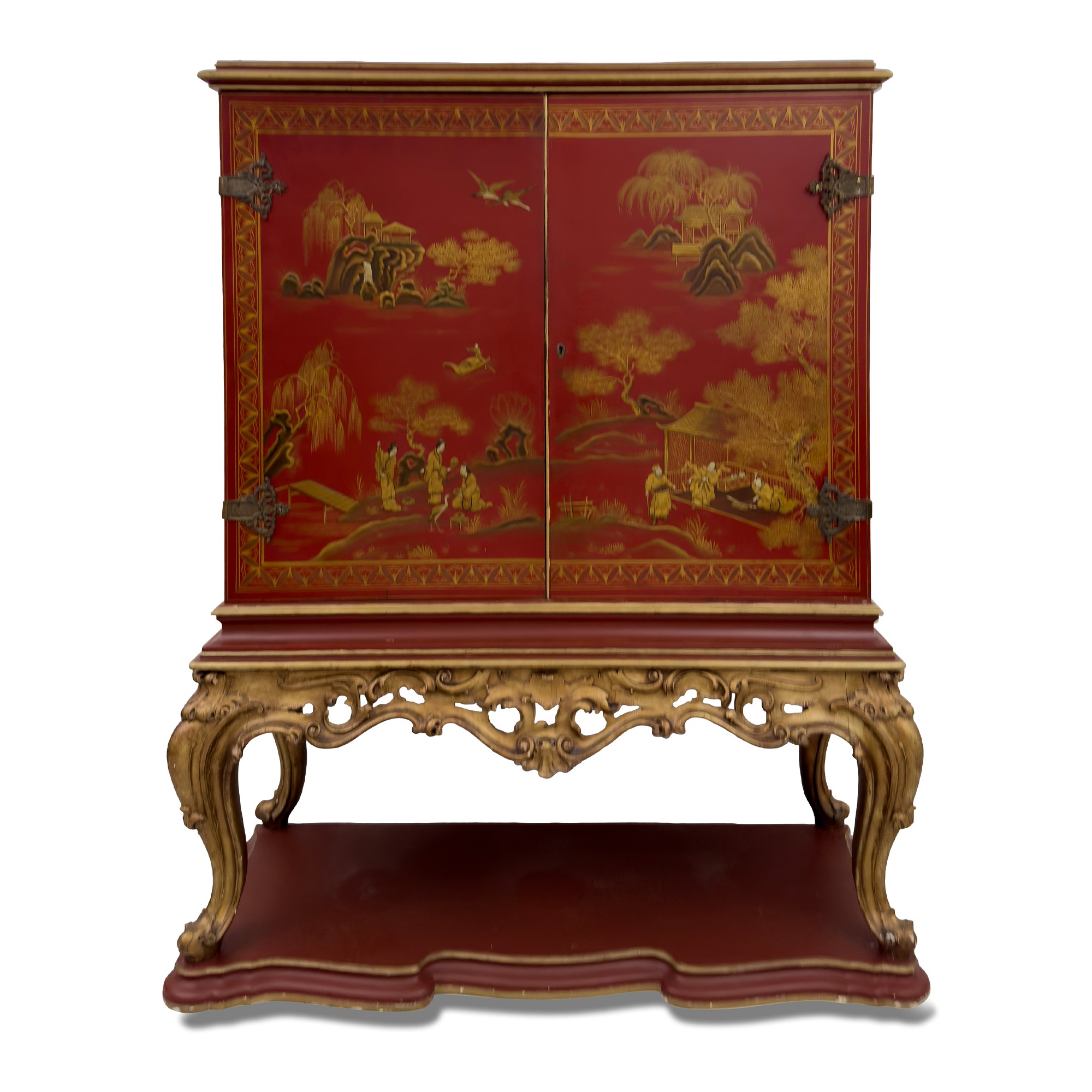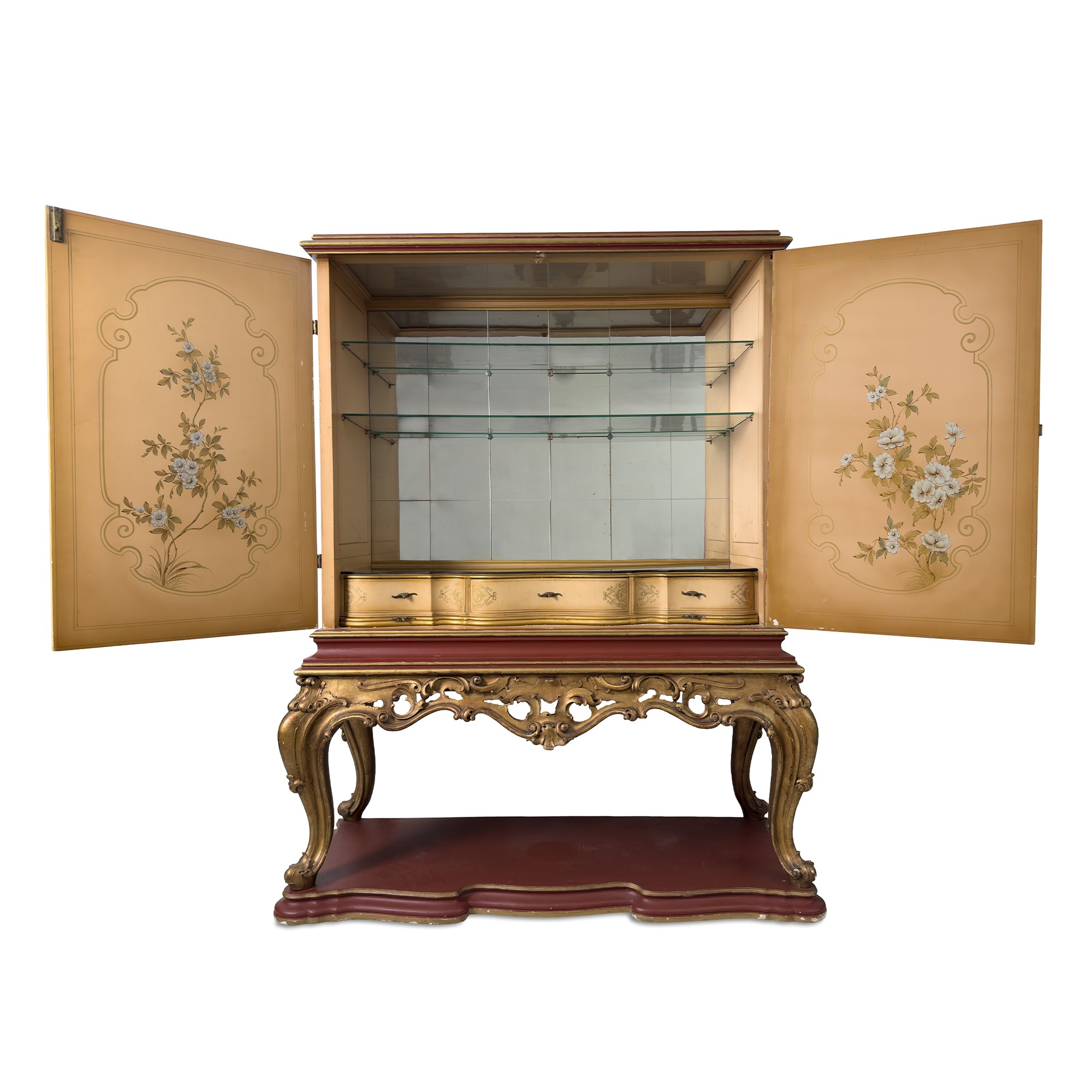 la parte superiore di forma parallelepipeda decorato in rilievo a paesaggi con figure orientali e motivi floreali sui fianchi: il fronte รจ scandito da due ante che svelano un interno con fondo di specchio e ripiani in vetro sovrastanti tre cassetti. La parte inferiore intagliata a volute in parte traforate; gambe centinate poggianti su una pedana, cm. 165x134x55 circa