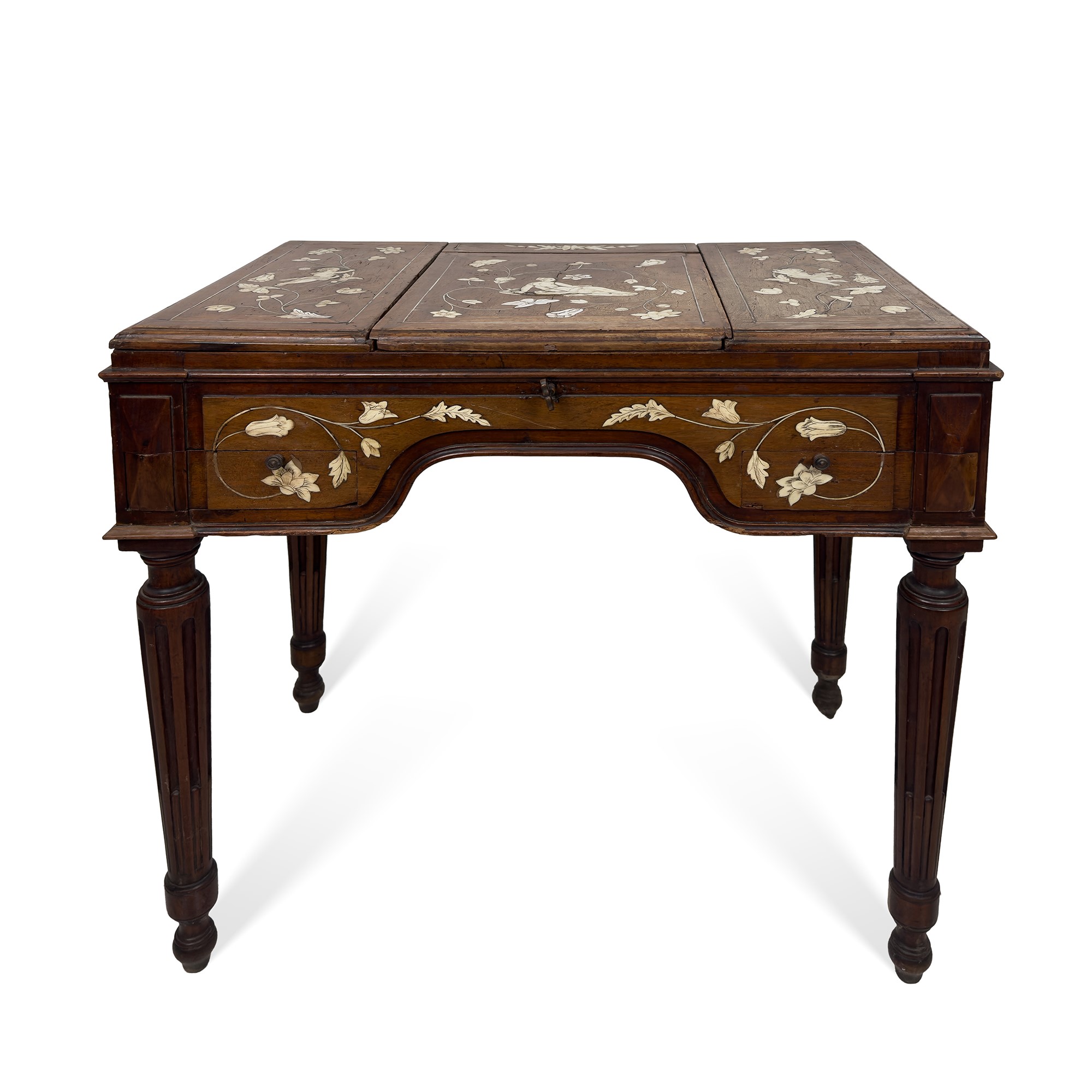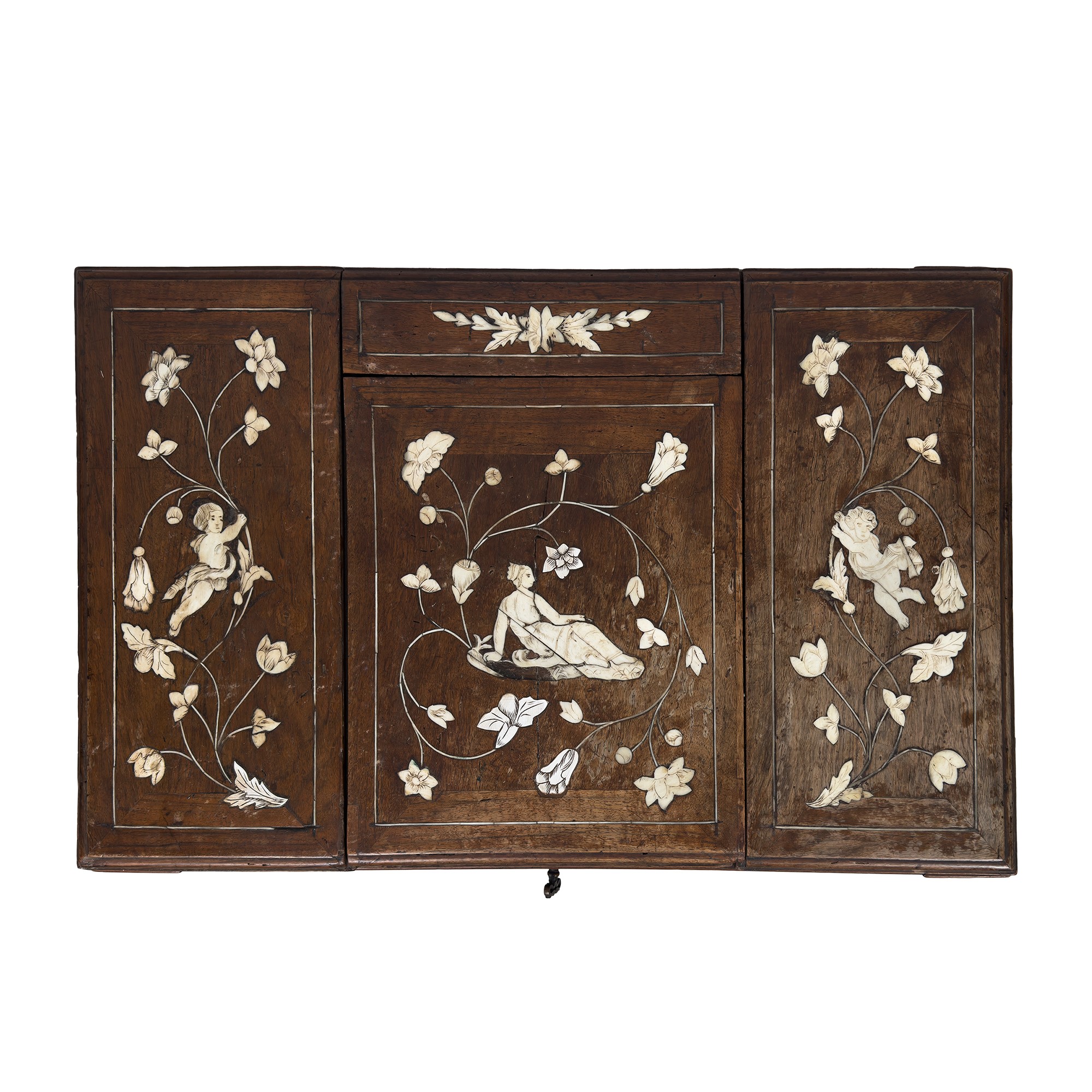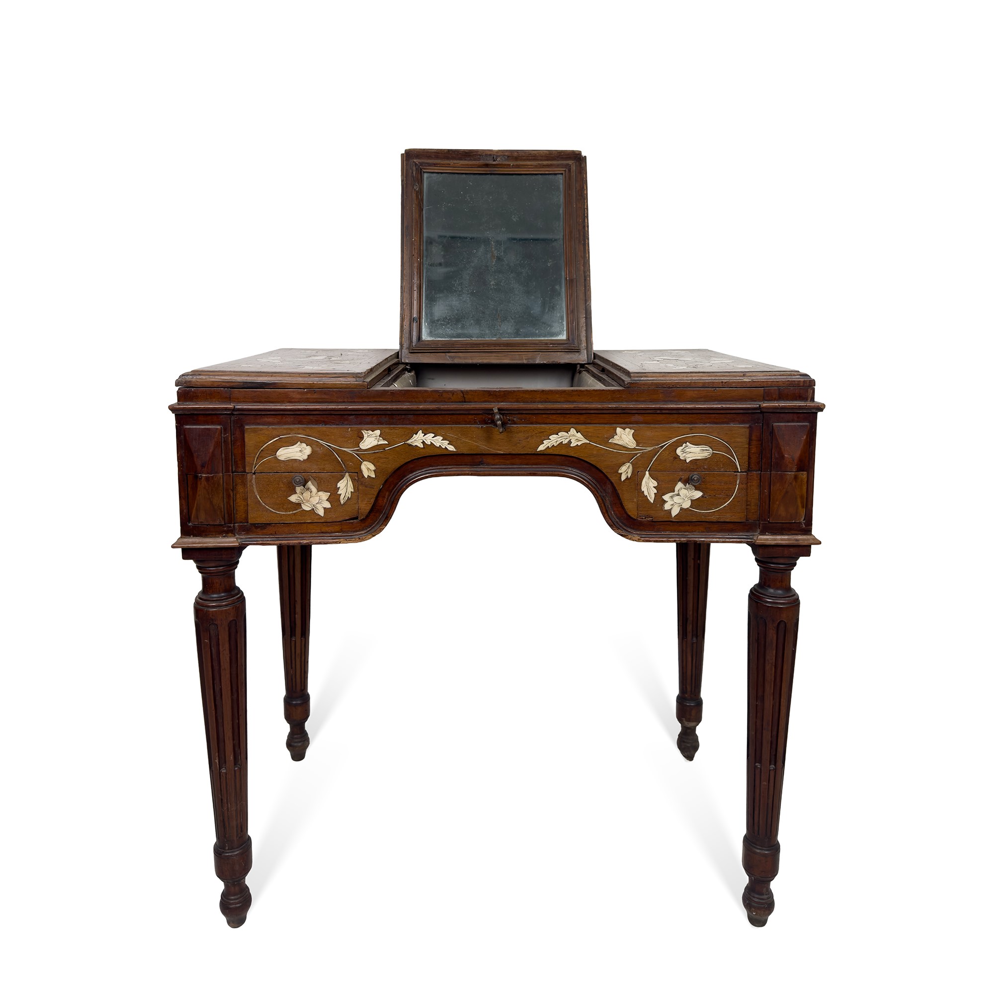 interamente intarsiato a figure mitologiche tra motivi floreali, piano rettangolare celante uno specchio e due vani laterali; fascia guarnita di due tiretti; gambe scanalate, cm. 73x77,5x48 (difetti)