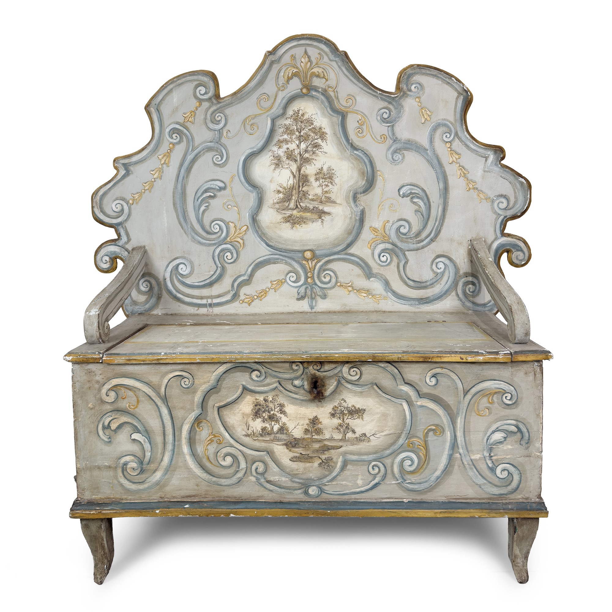 schienale sagomato e seduta caratterizzati da una riserva racchiudente un paesaggio alberato; il piano della seduta parzialmente apribile, corte gambe a voluta, cm. 138x 109x46 (restauri e difetti)