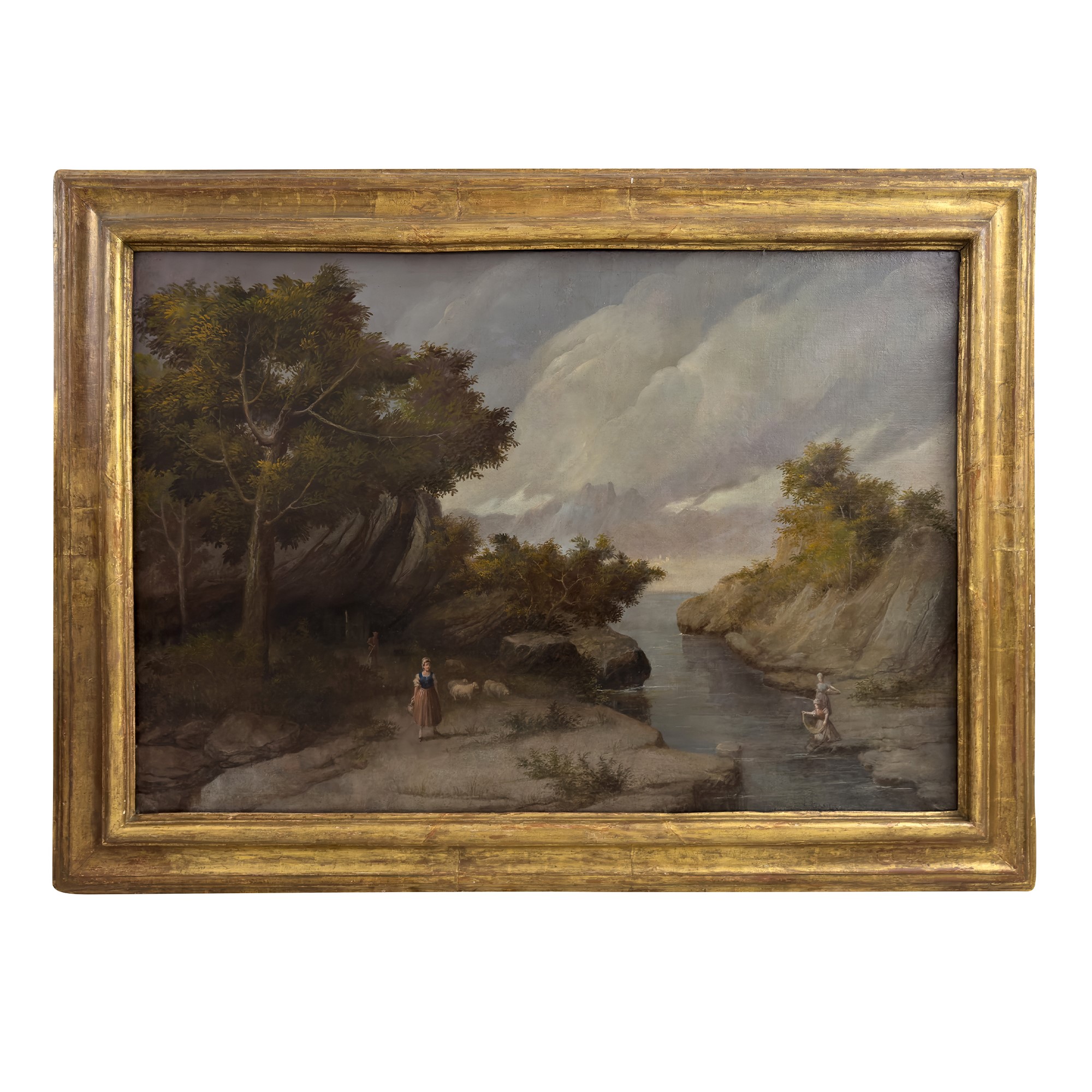 Paesaggio fluviale con lavandaie e contadina con gregge