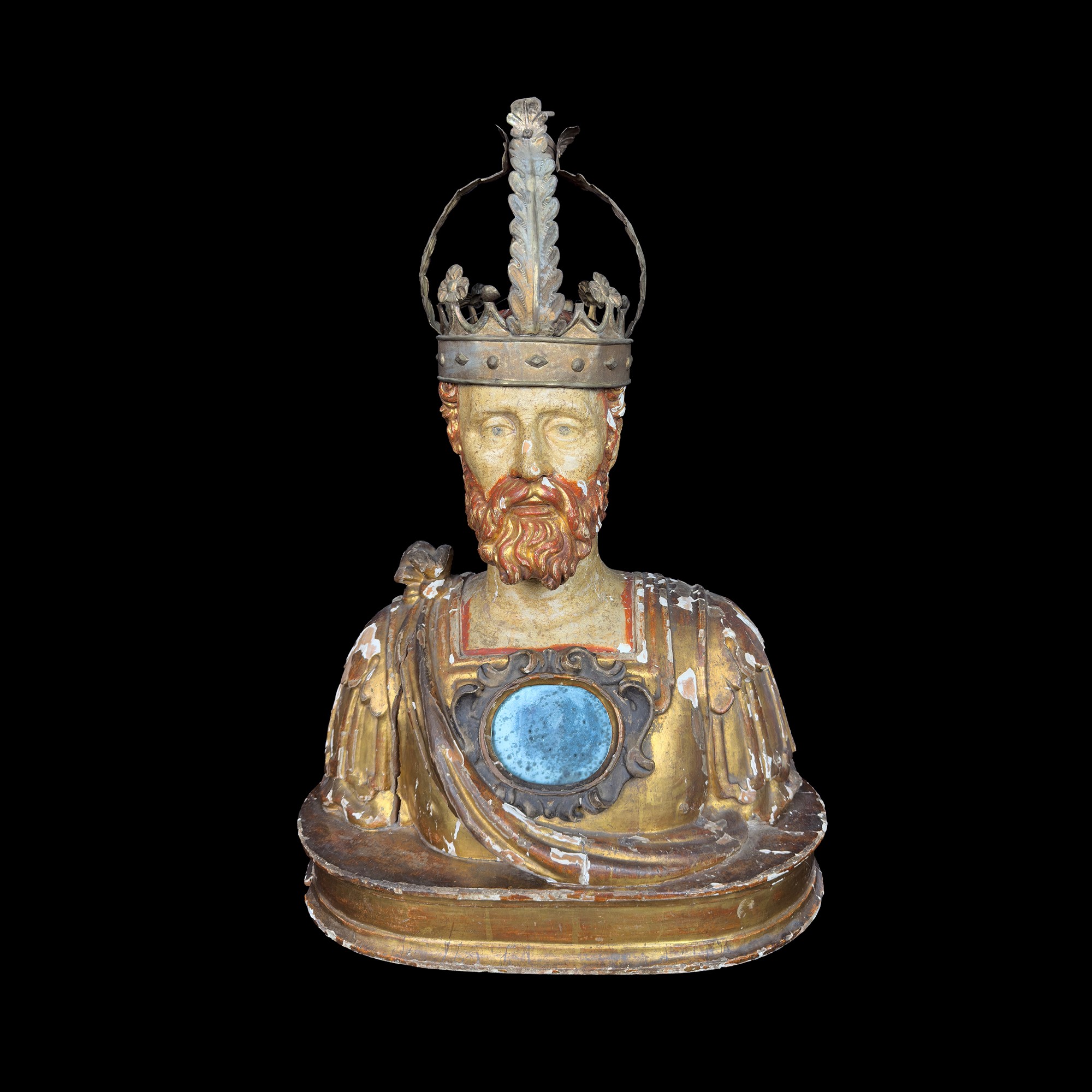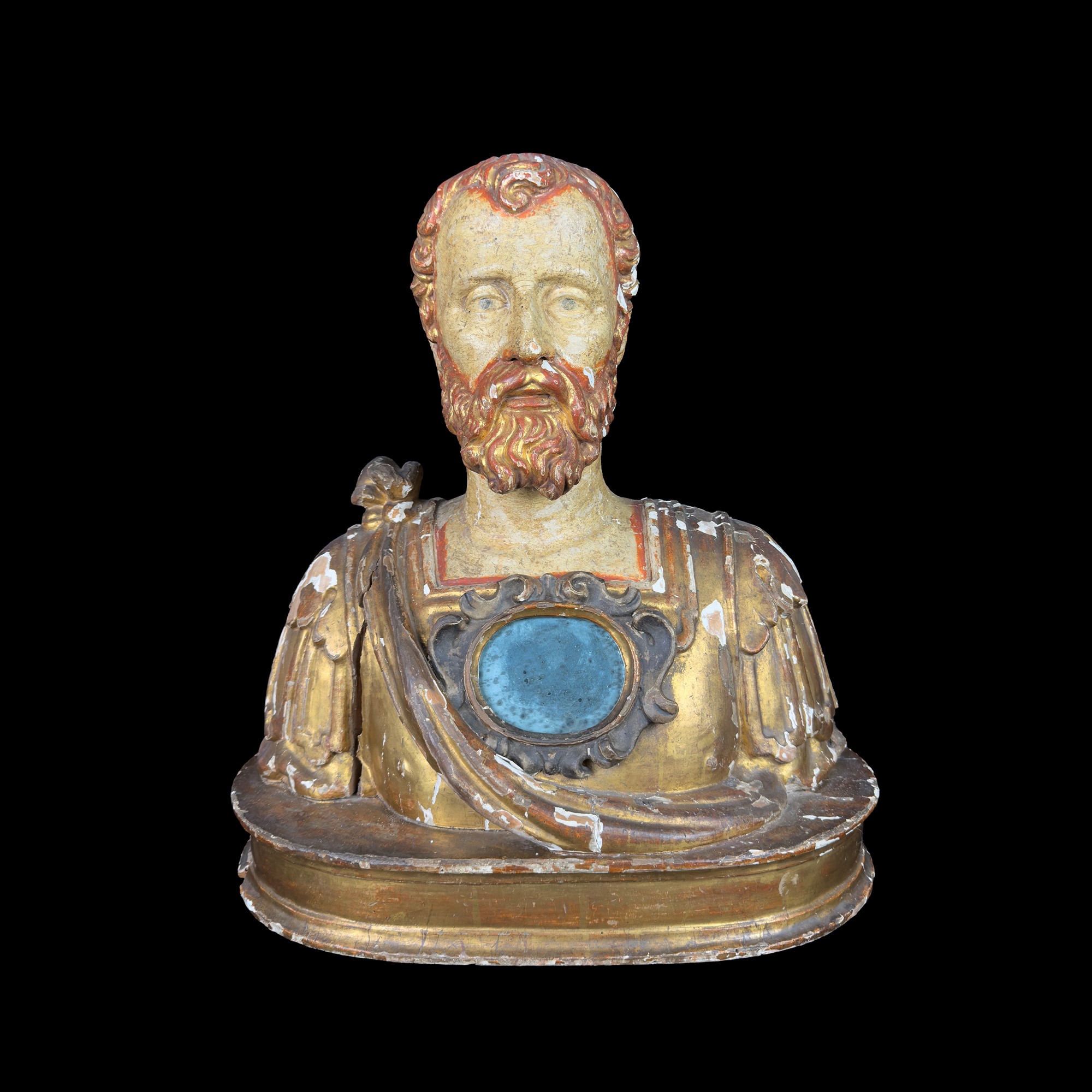 Reliquiario in legno laccato e dorato scolpito a busto virile, Napoli, metà del XVII secolo