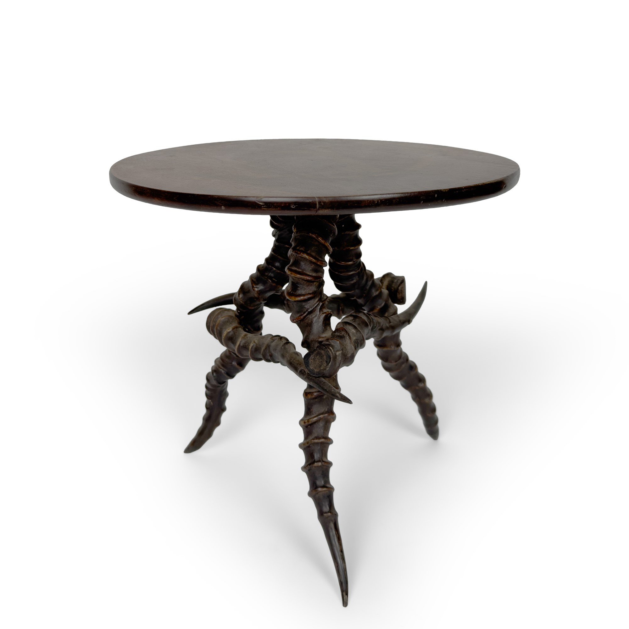 Sgabello con seduta circolare in legno sostenuto da corna di animale