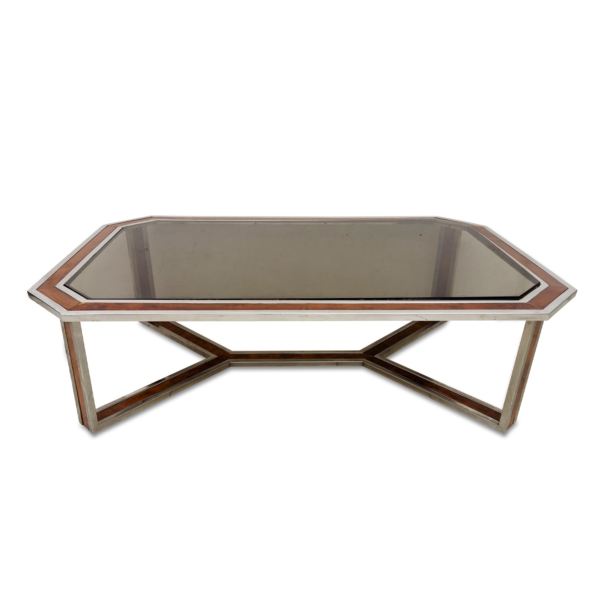 Tavolino da salotto di forma ottagonale in metallo cromato e radica, anni '80