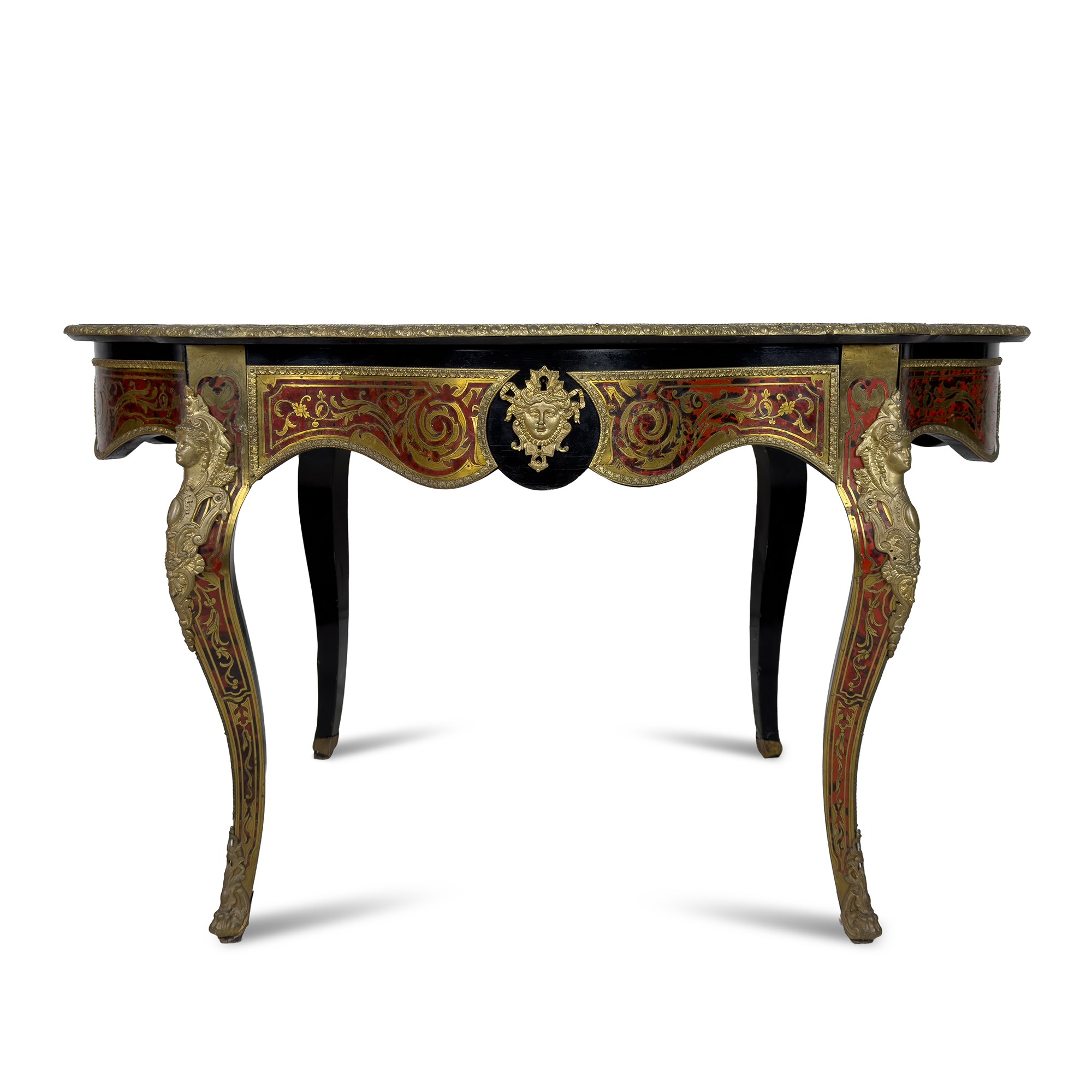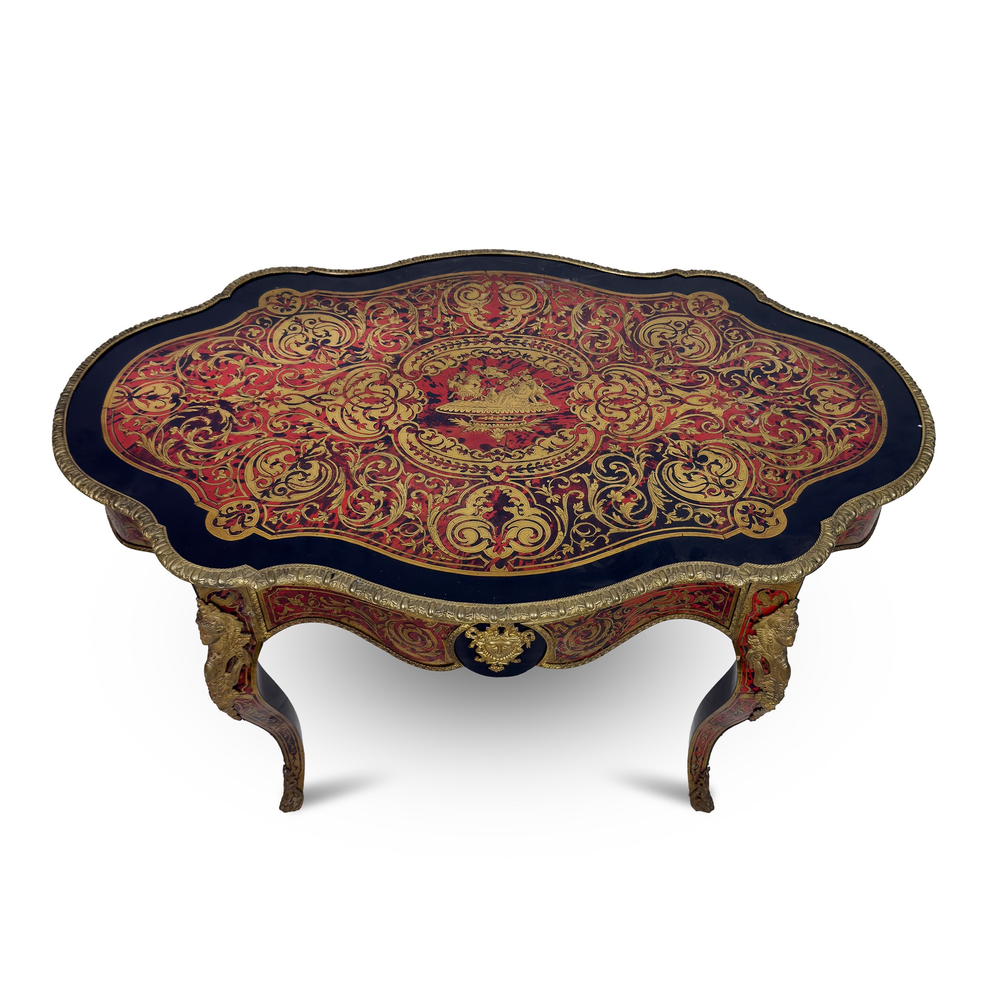 piano dal profilo sagomato centrato da un trionfo bacchico fra numerosi girali fogliati; un cassetto sulla fascia; gambe a sciabola; applicazioni in metallo dorato, cm. 75x132x83