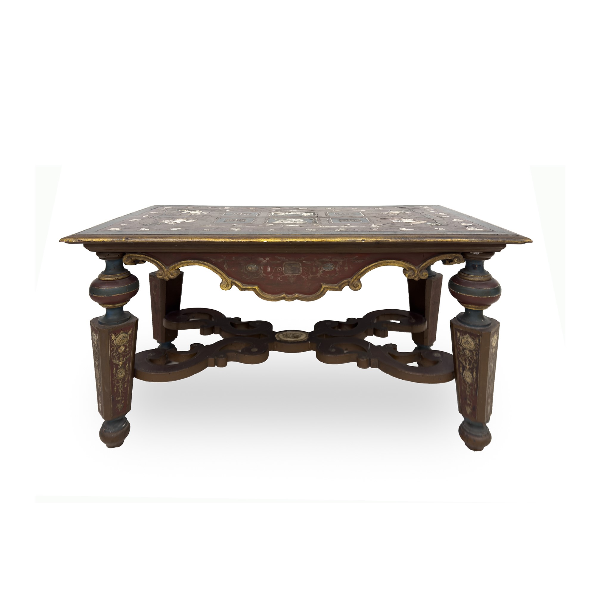 piano rettangolare intarsiato a scene di caccia tra stemmi nobiliari e foglie di vite; gambe a sezione ottagonale parimenti intarsiate riunite da traverse a volute, cm. 57x103x58 (evidenti mancanze)