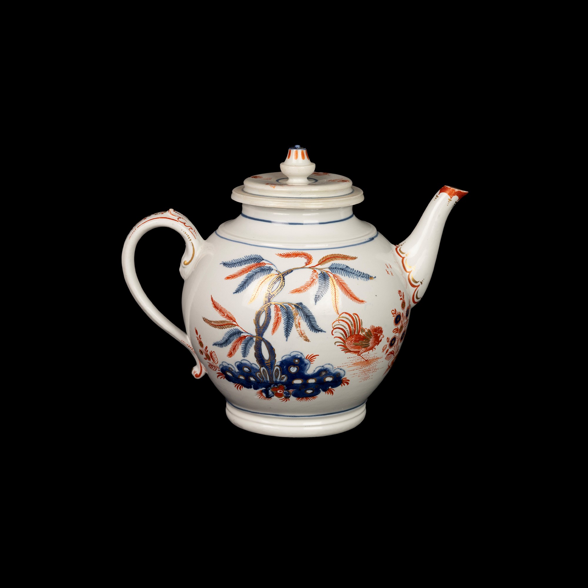 dipinta "al galletto" in rosso ferro, blu e oro; corpo globulare; presa a voluta; coperchio piatto con presa a trottola, h. cm. 18 (il coperchio restaurato)
