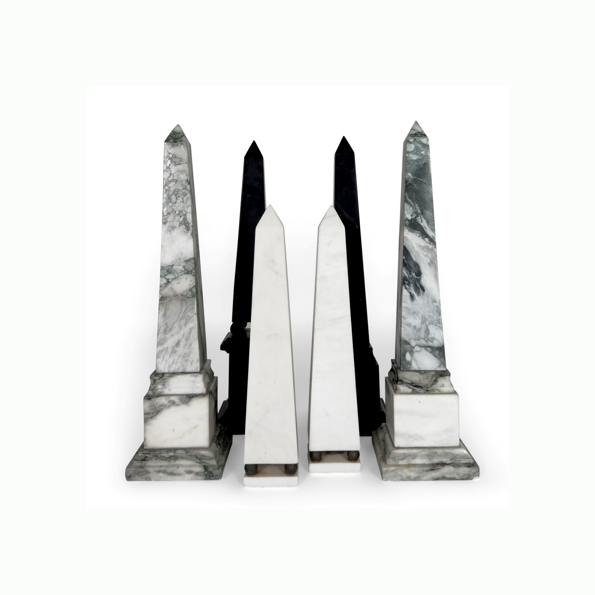Tre coppie di obelischi in marmo nero, marmo bianco e breccia verde