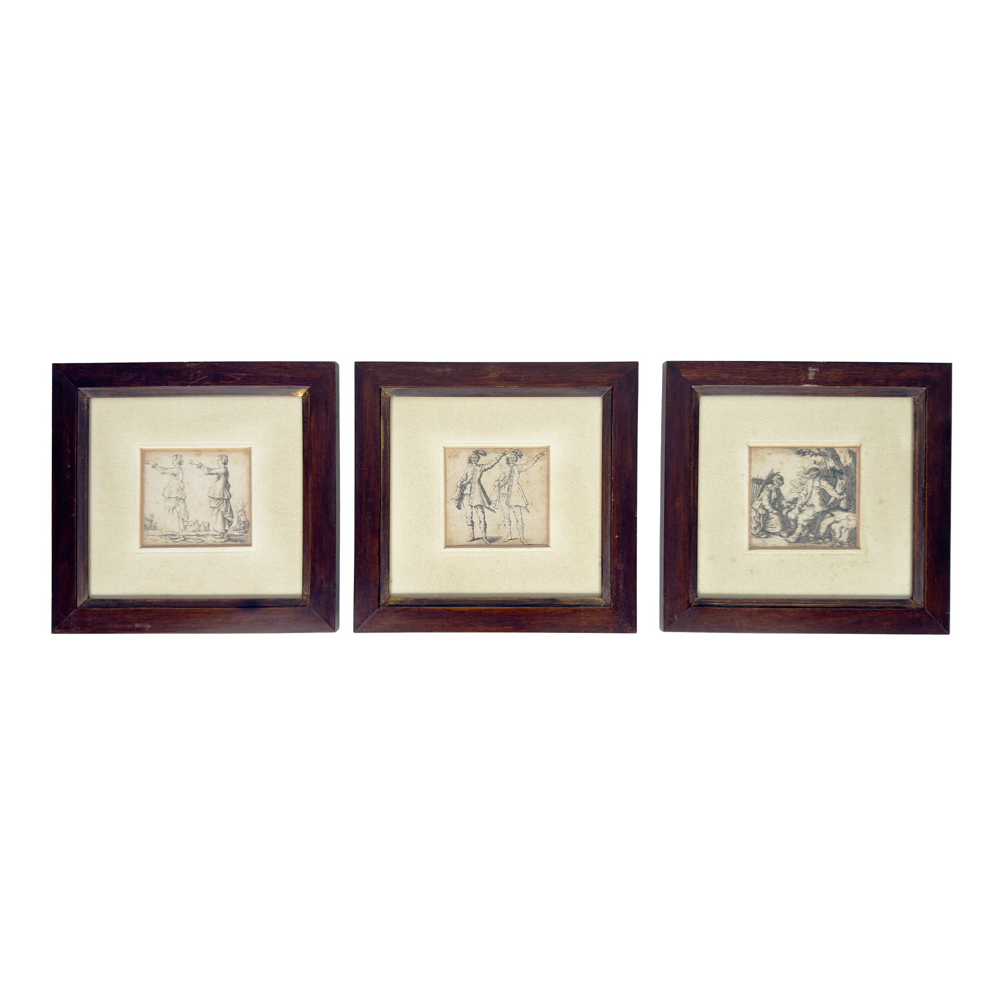 Tre incisioni raffiguranti una scena di genere e figure in costume, XVIII-XIX secolo