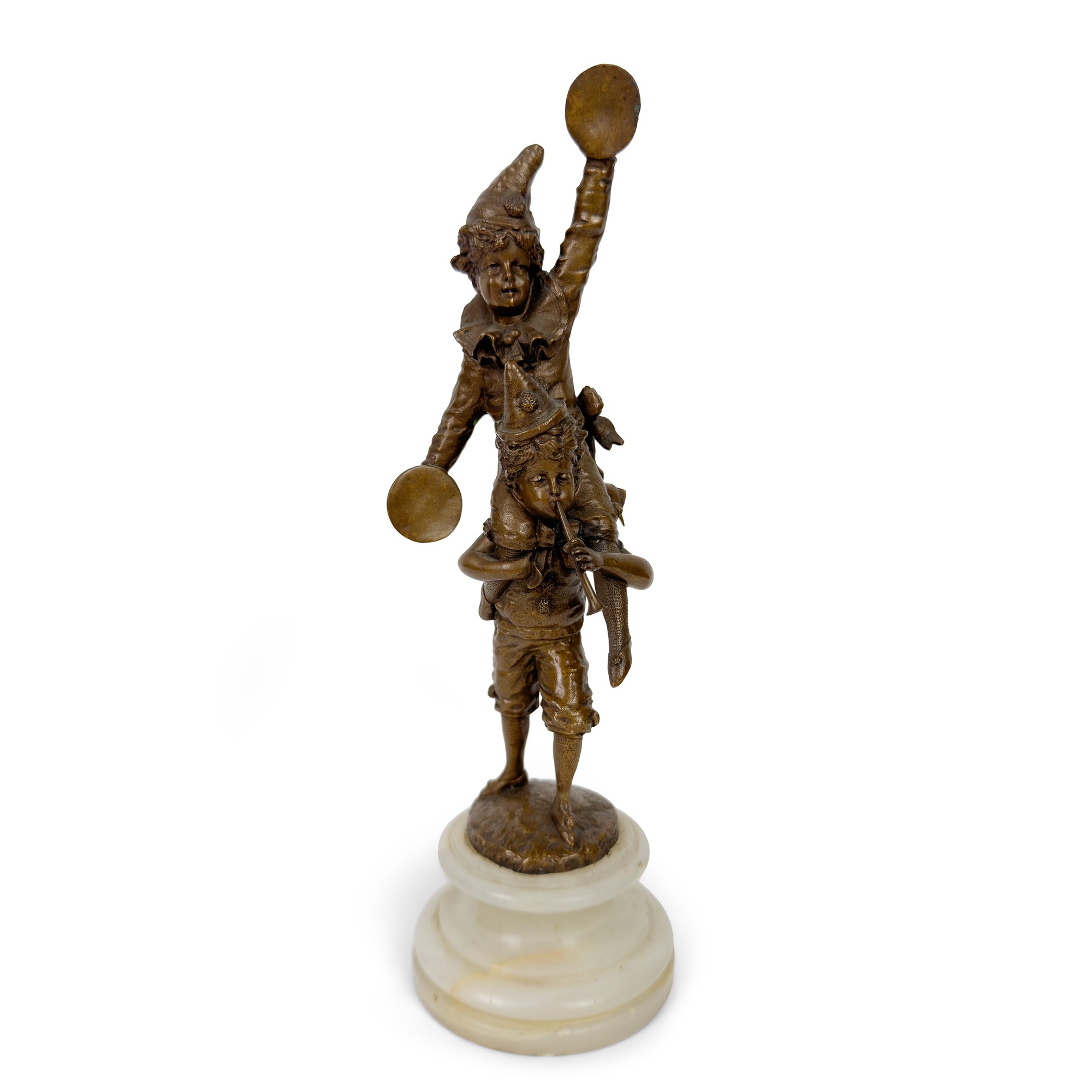 gruppo in bronzo patinato su basetta circolare in onice, complessivamente h. cm. 26