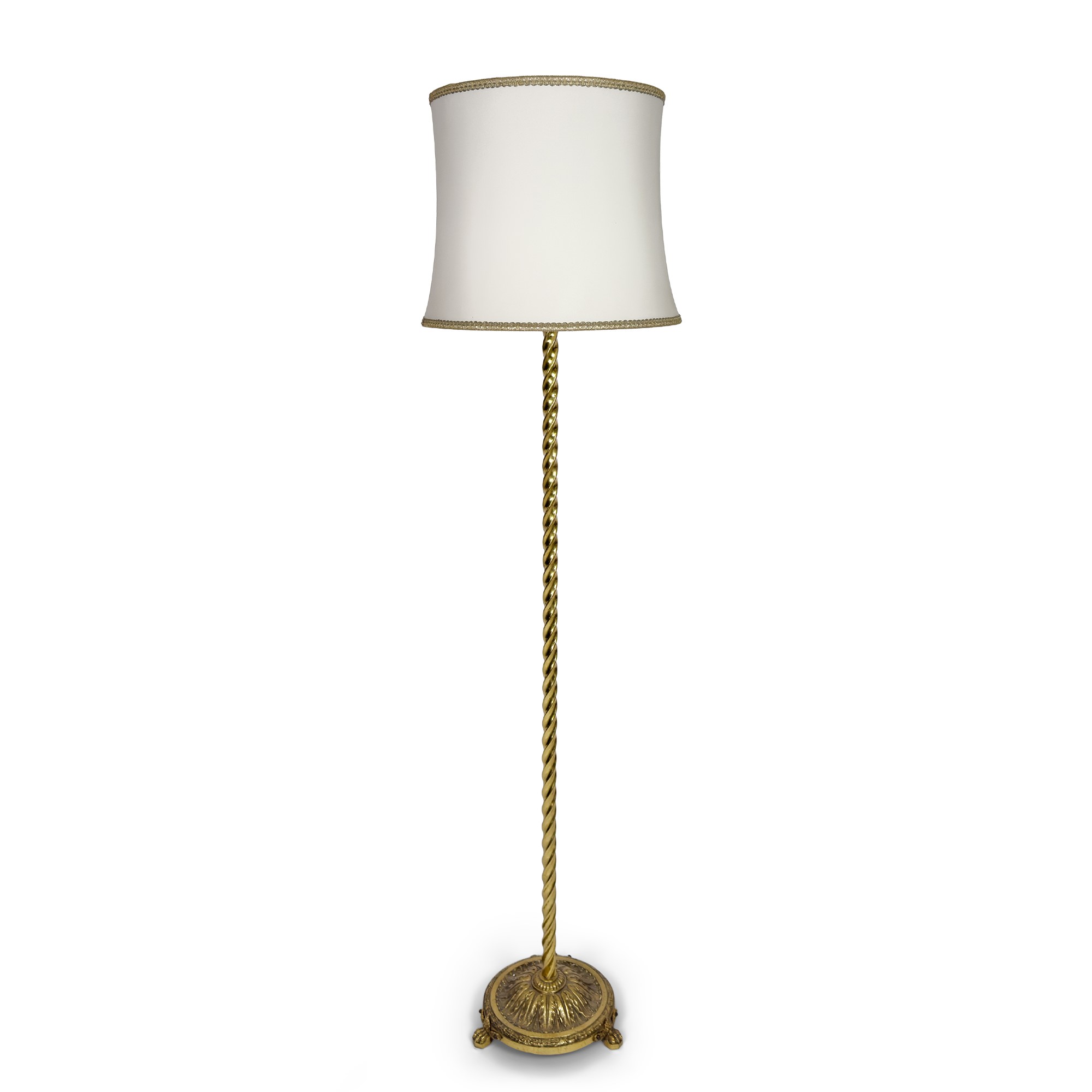 with twisted stem and circular foot chiseled with leaves; complete with lampshade, overall h. 182 cm
