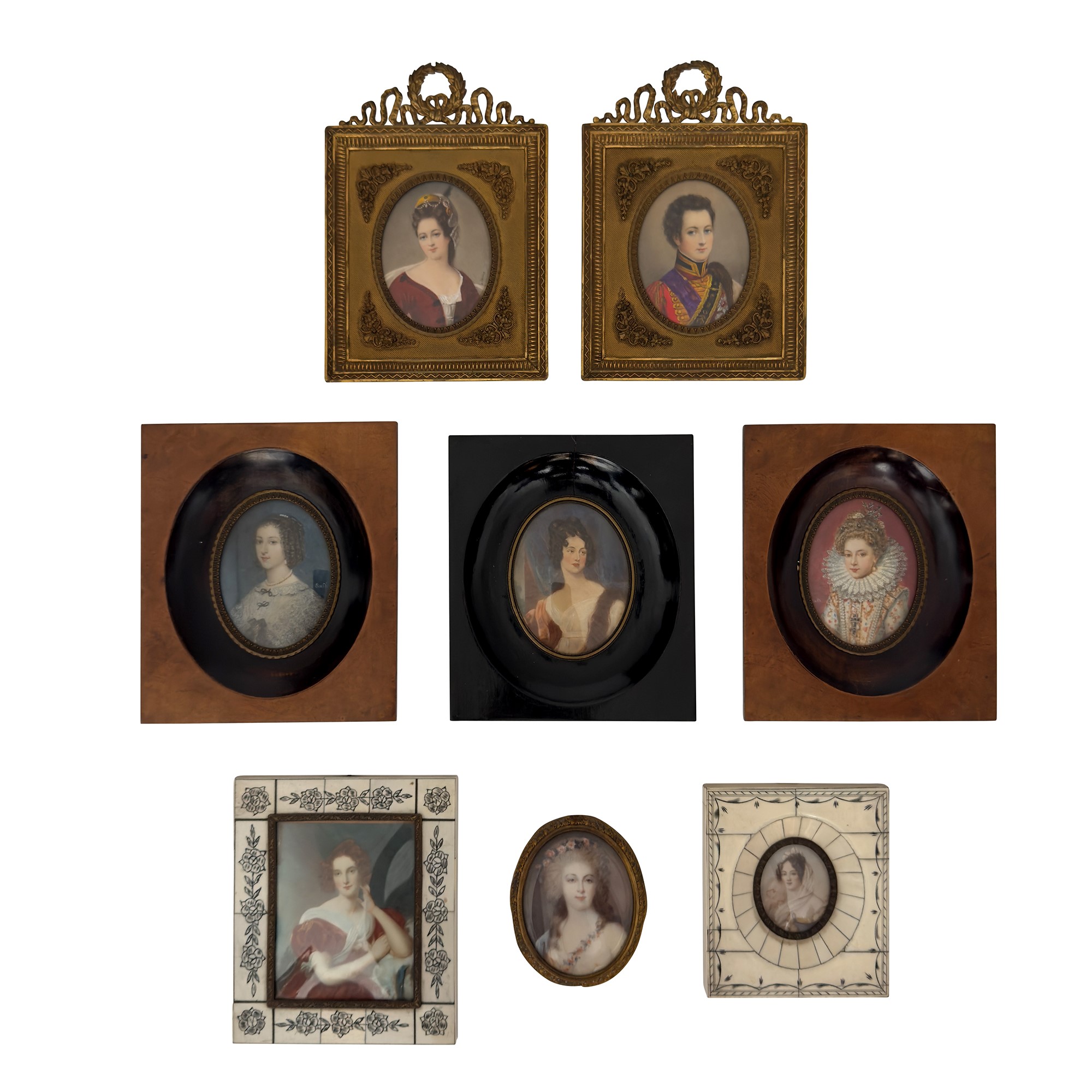 depicting portraits of aristocrats, overall dimensions ranging from 8.5 x 7 cm to 18 x 12.5 cm (one wooden frame is cracked)