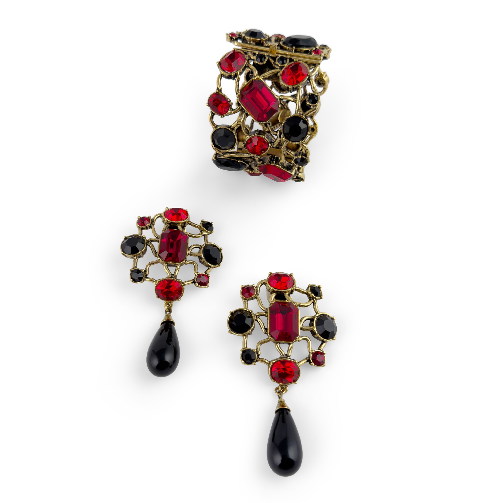 demi-parure composed of a rigid bracelet and earrings in gilt metal with a lattice design adorned with faceted red and black crystals, the earrings with drop pendants, earrings: l. 9 cm; bracelet: d. 6.5 cm