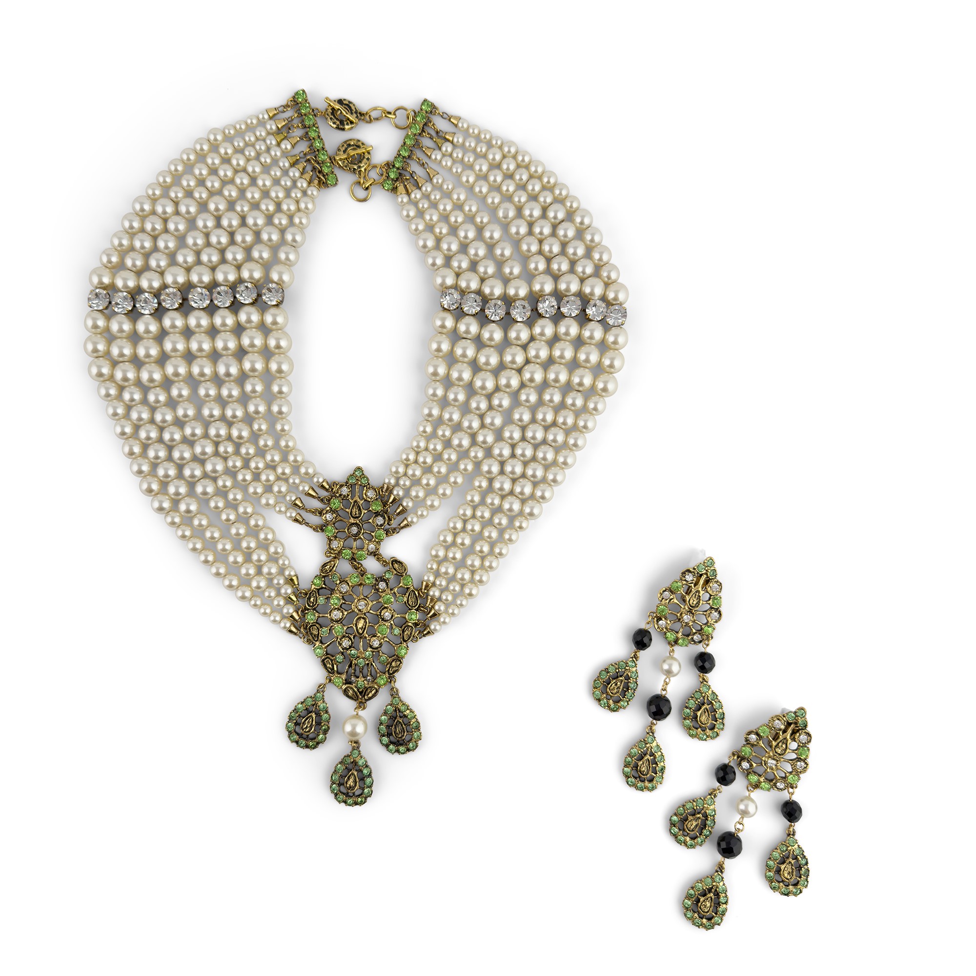 demi-parure composed of necklace and earrings, the necklace in gilt metal with multiple strands of pearls and a central medallion adorned with faceted colorless and green crystals, the earrings with three drop pendants; necklace l. 40 cm; earrings: l. 12 cm