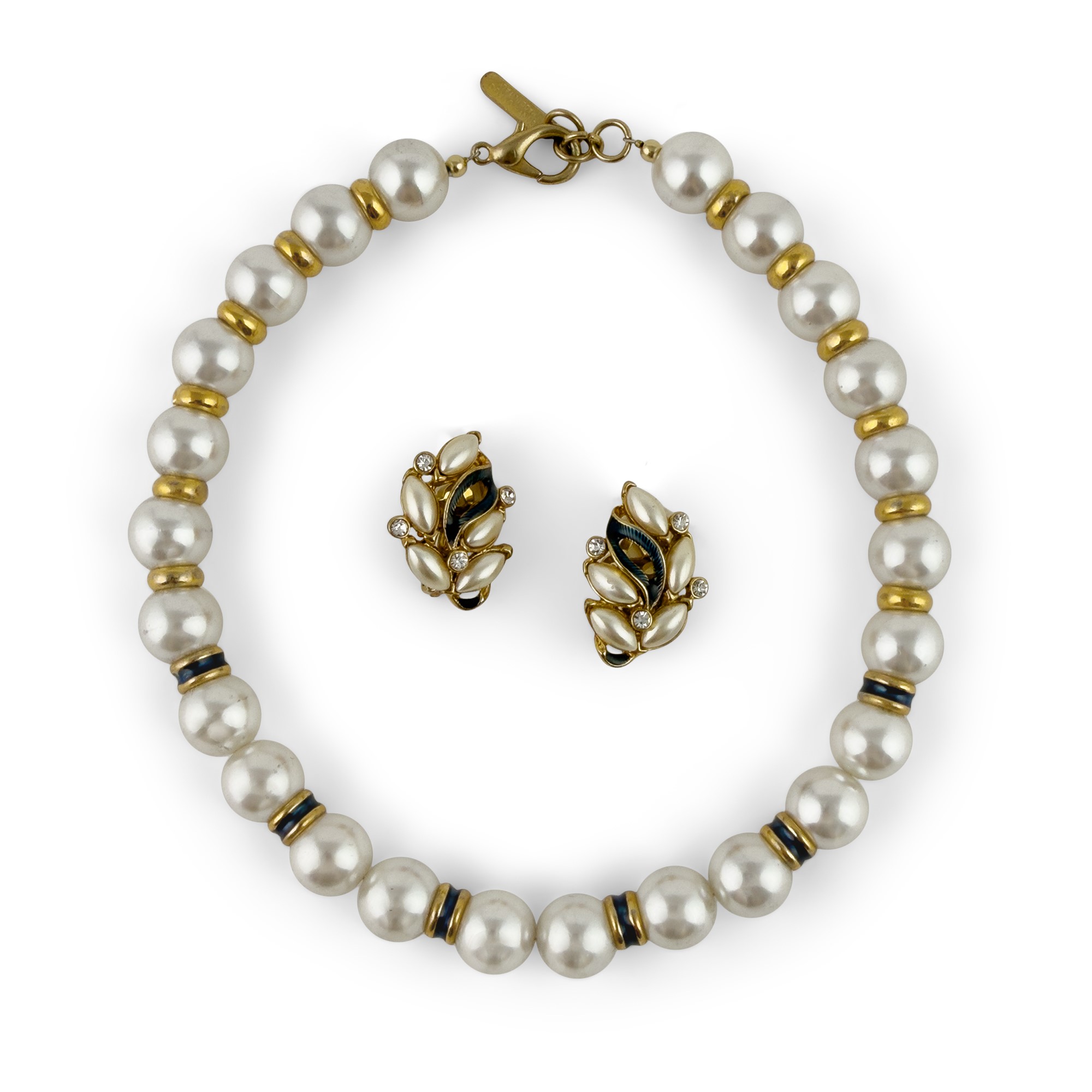 demi-parure composed of a necklace and clip earrings in faux pearls and gilt and enameled metal, earrings: h. 3 cm; necklace l. 36 cm