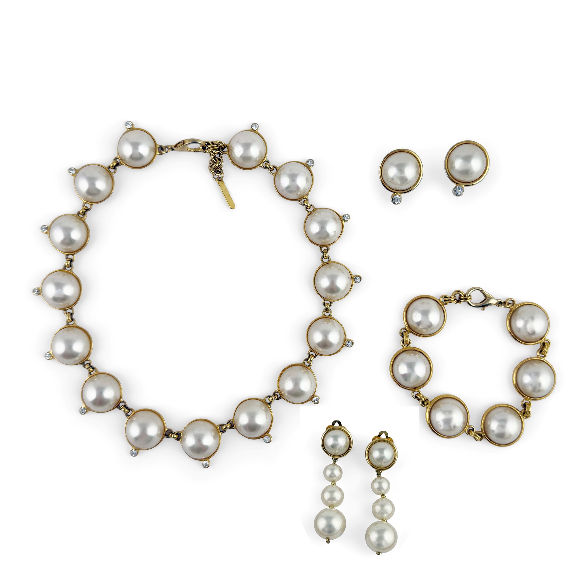 parure in gilt metal and half-pearls composed of a necklace, bracelet and two pairs of earrings, one of which pendant; the necklace: l. 40 cm; the bracelet: l. 20 cm; the pendant earrings: h. 6 cm