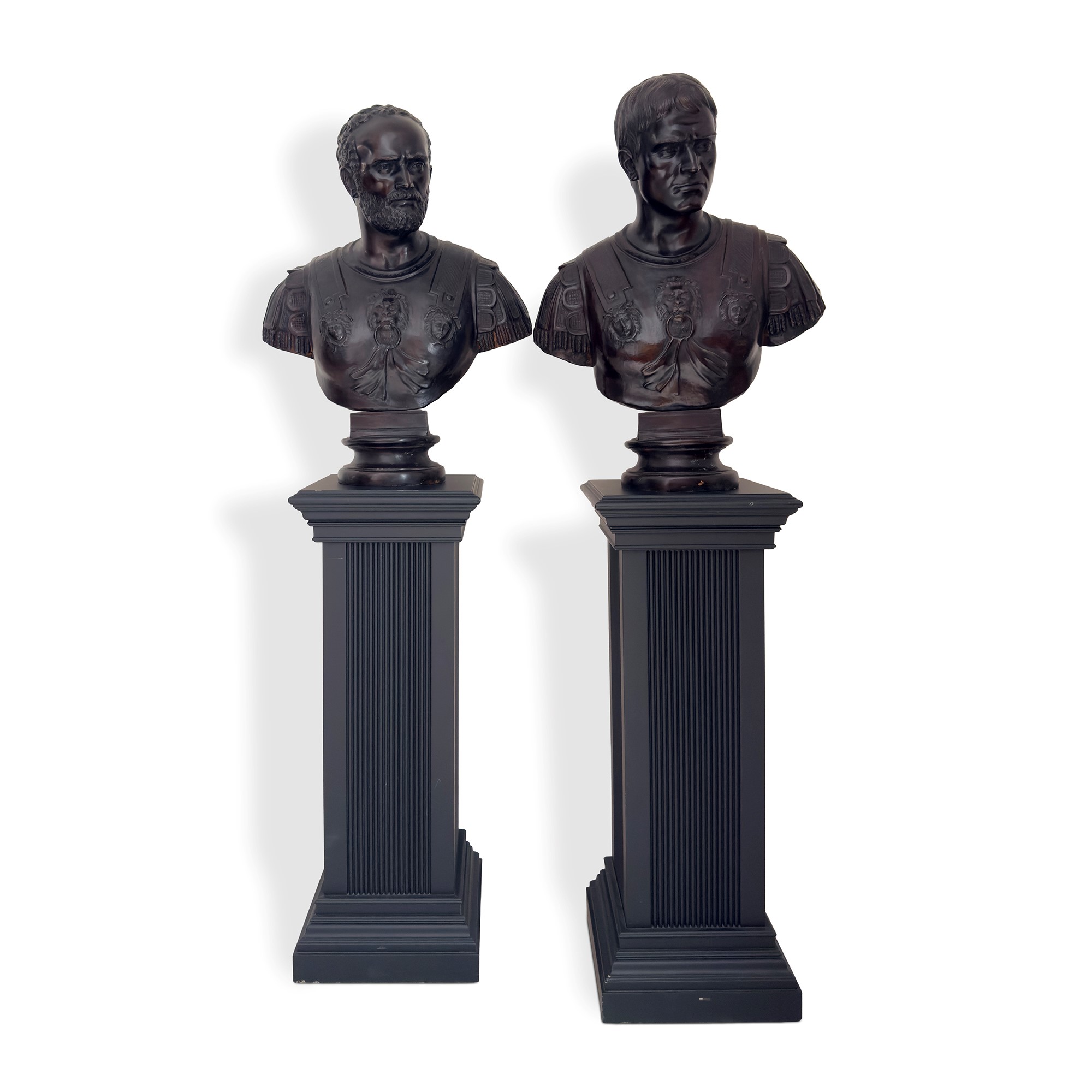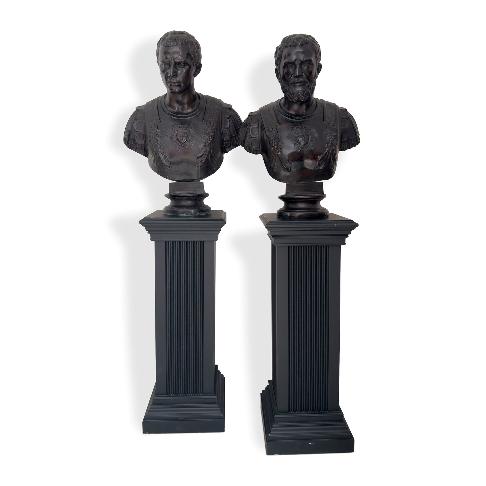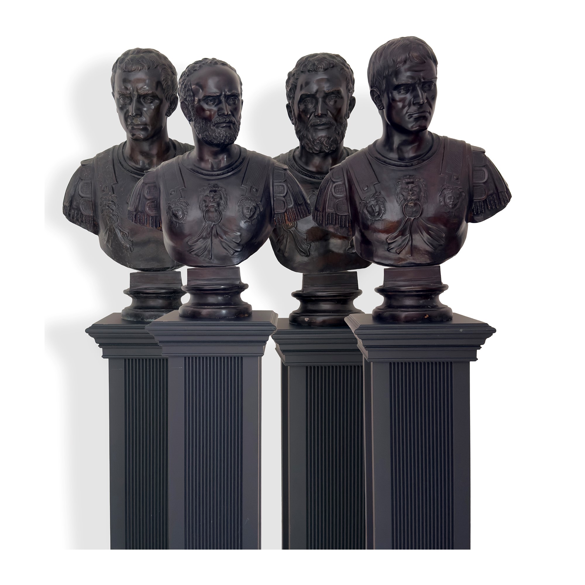 depicting Roman emperors wearing a cuirass, on circular bases; each bust is set on a fluted parallelepiped base in ebonized wood; each bust: h. 76 cm, w. approx. 60 cm; the pedestals: 100 x 38 x 38 cm