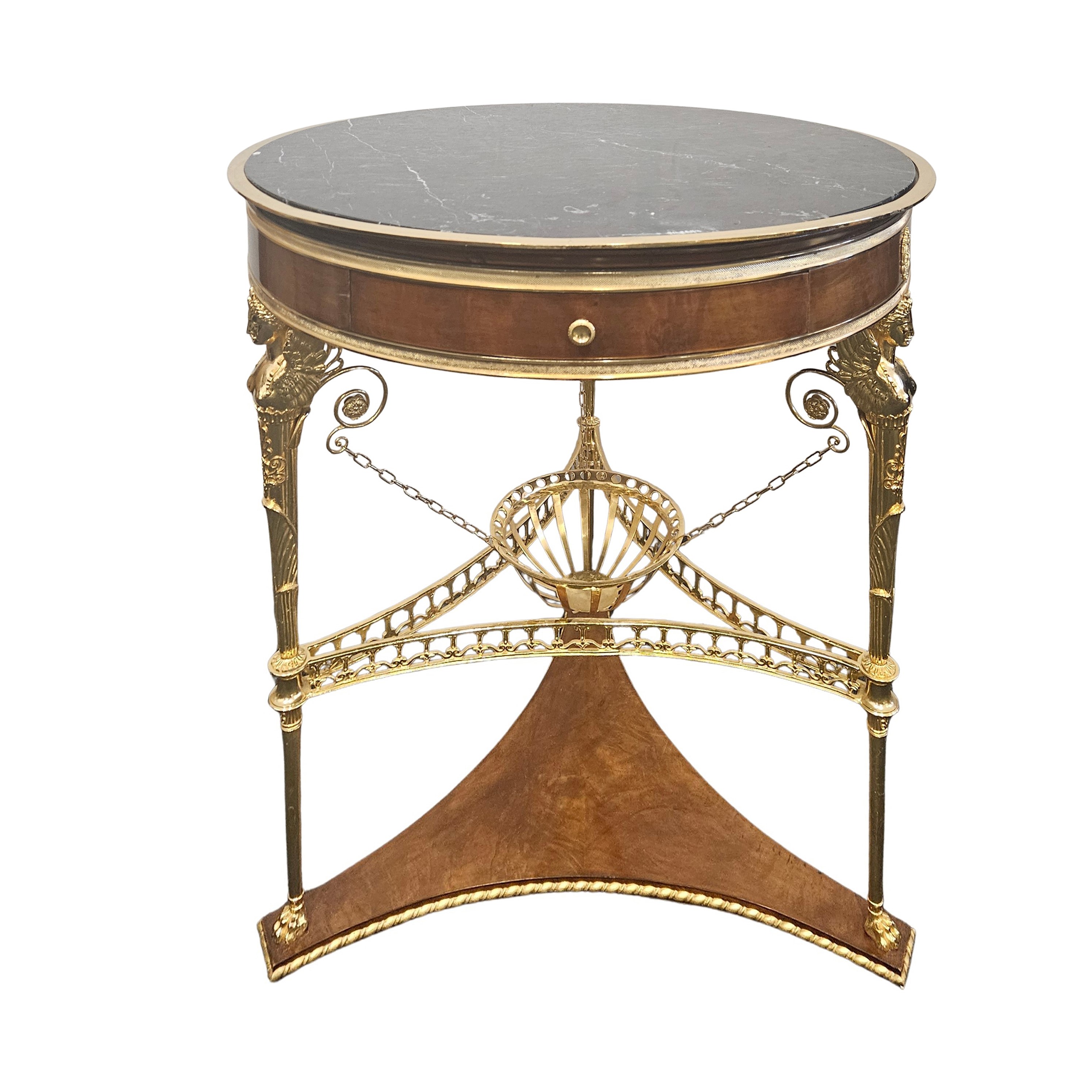 circular inset black marble top; one drawer in the frieze beneath the top; three legs terminating in a winged female caryatid, joined by a small balustrade supporting an openwork basket held by chains; triangular base, approx. 78x70 cm