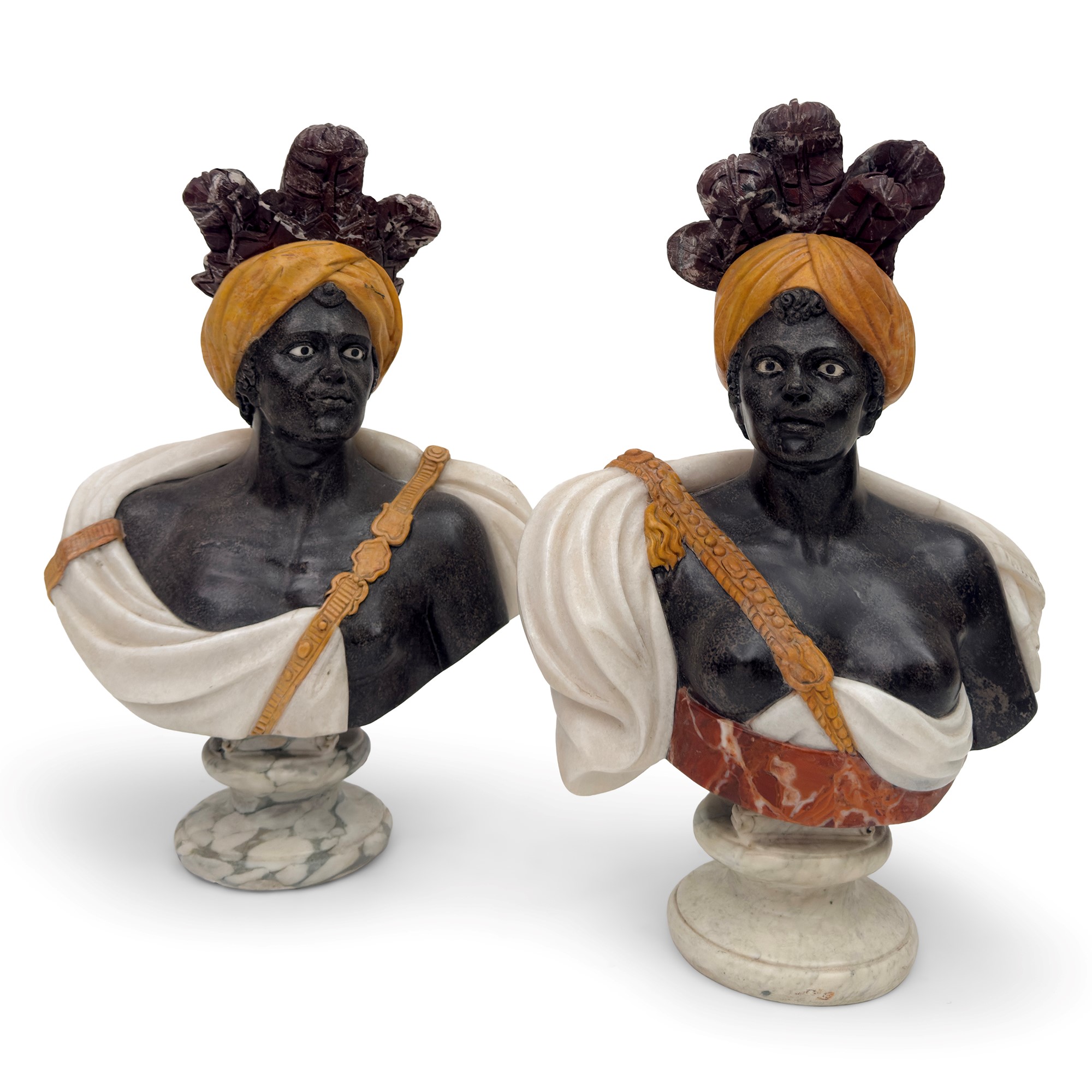 Pair of busts in polychrome marbles, 20th century