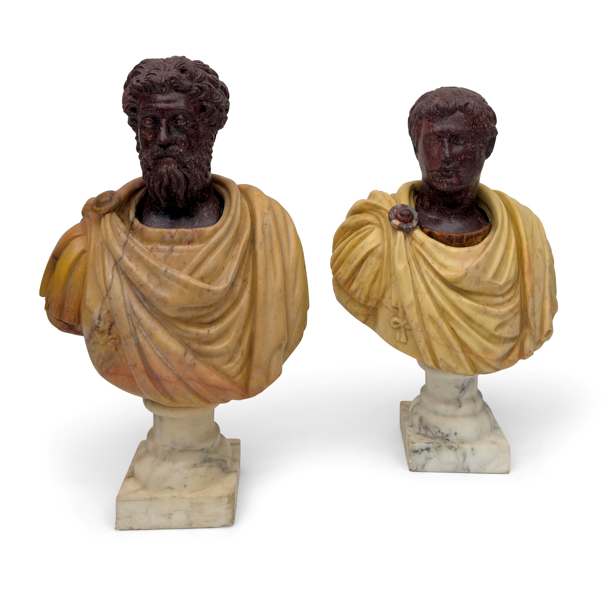 Pair of busts of Roman emperors in porphyry and polychrome marbles