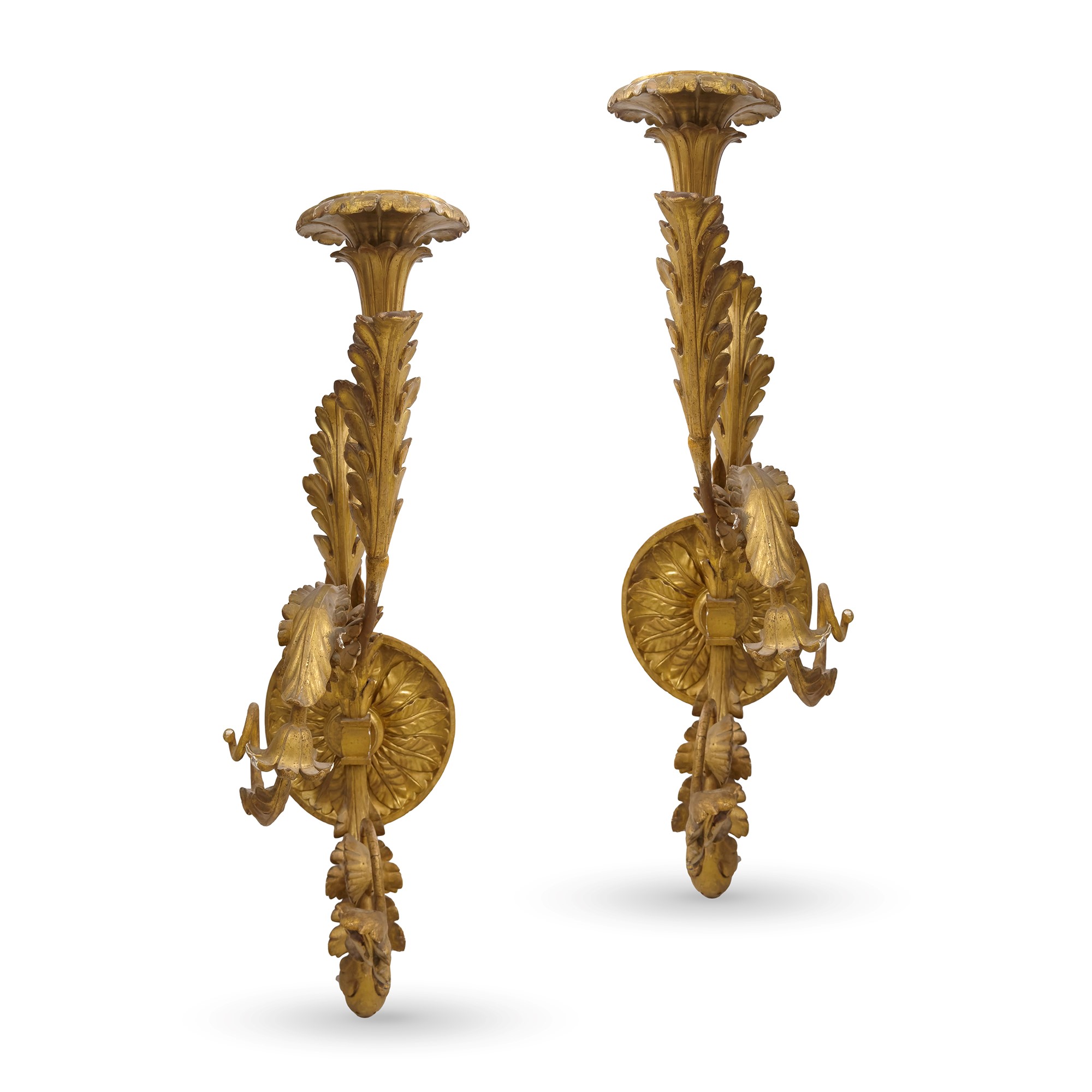 characterized by a scroll supporting acanthus leaves; circular wall mount carved with lanceolate leaves and under-leaves, h. 114 cm