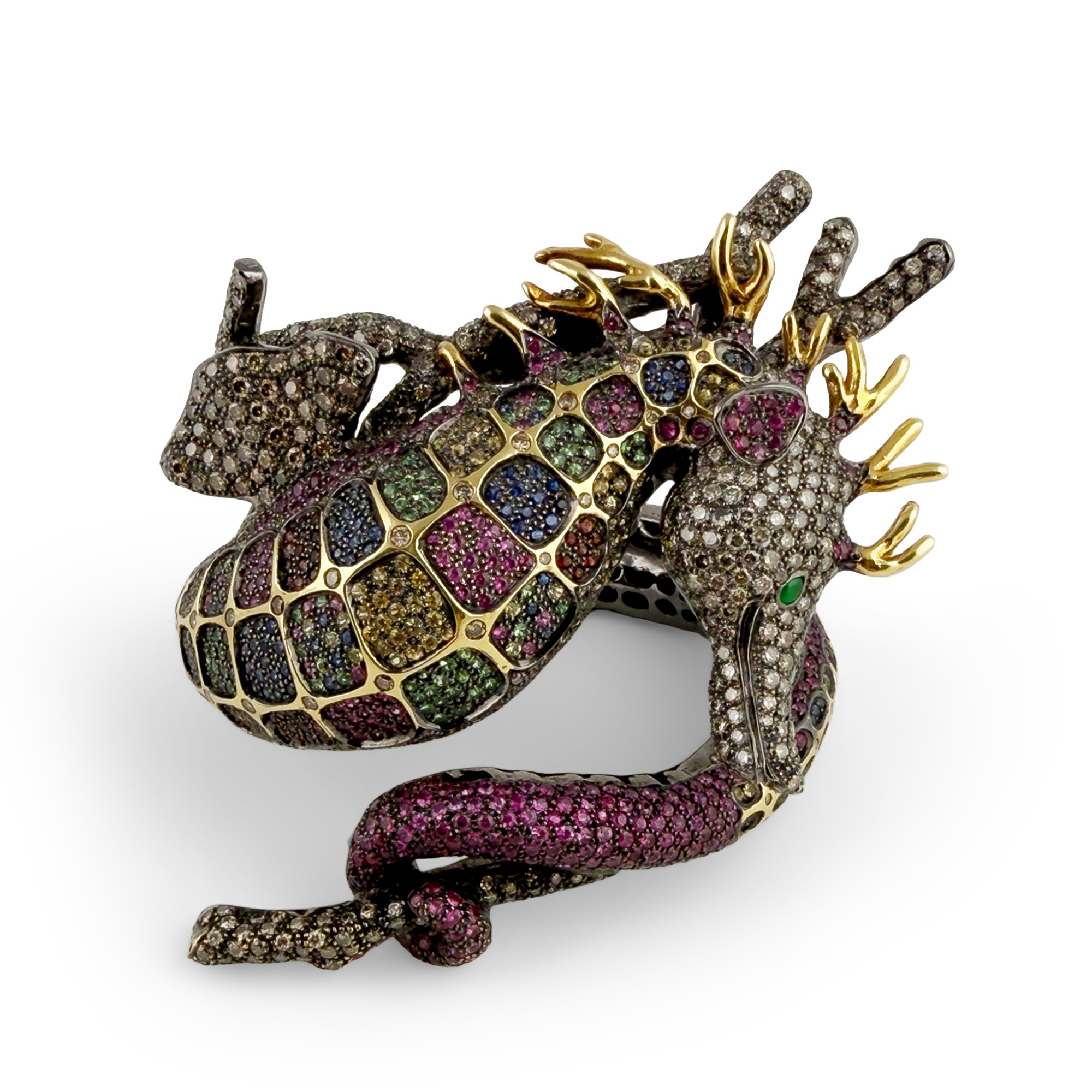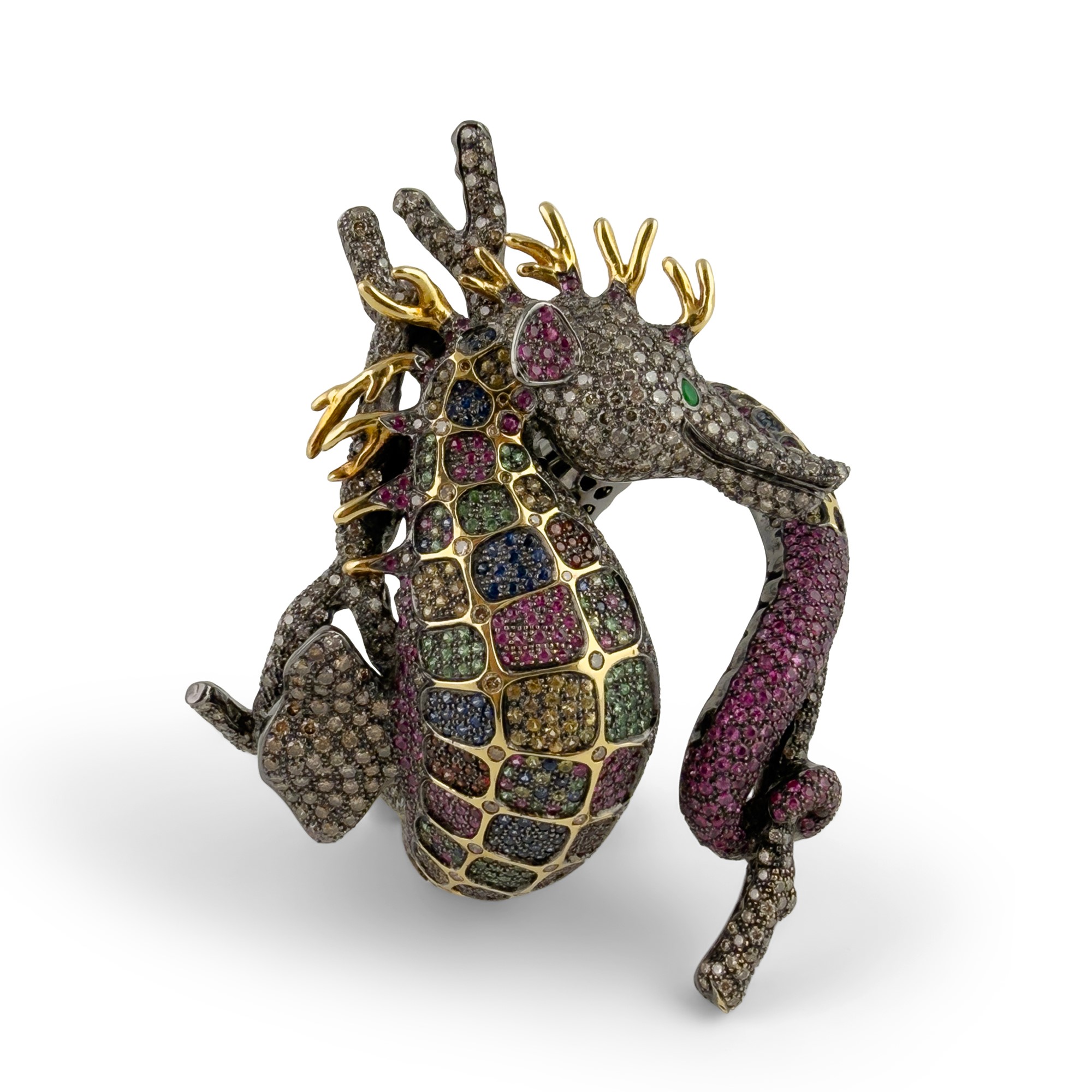 in the shape of a seahorse, entirely embellished with pavé colored stones, d. 7.5 cm; h. 7 cm, gross weight 227 gr.
