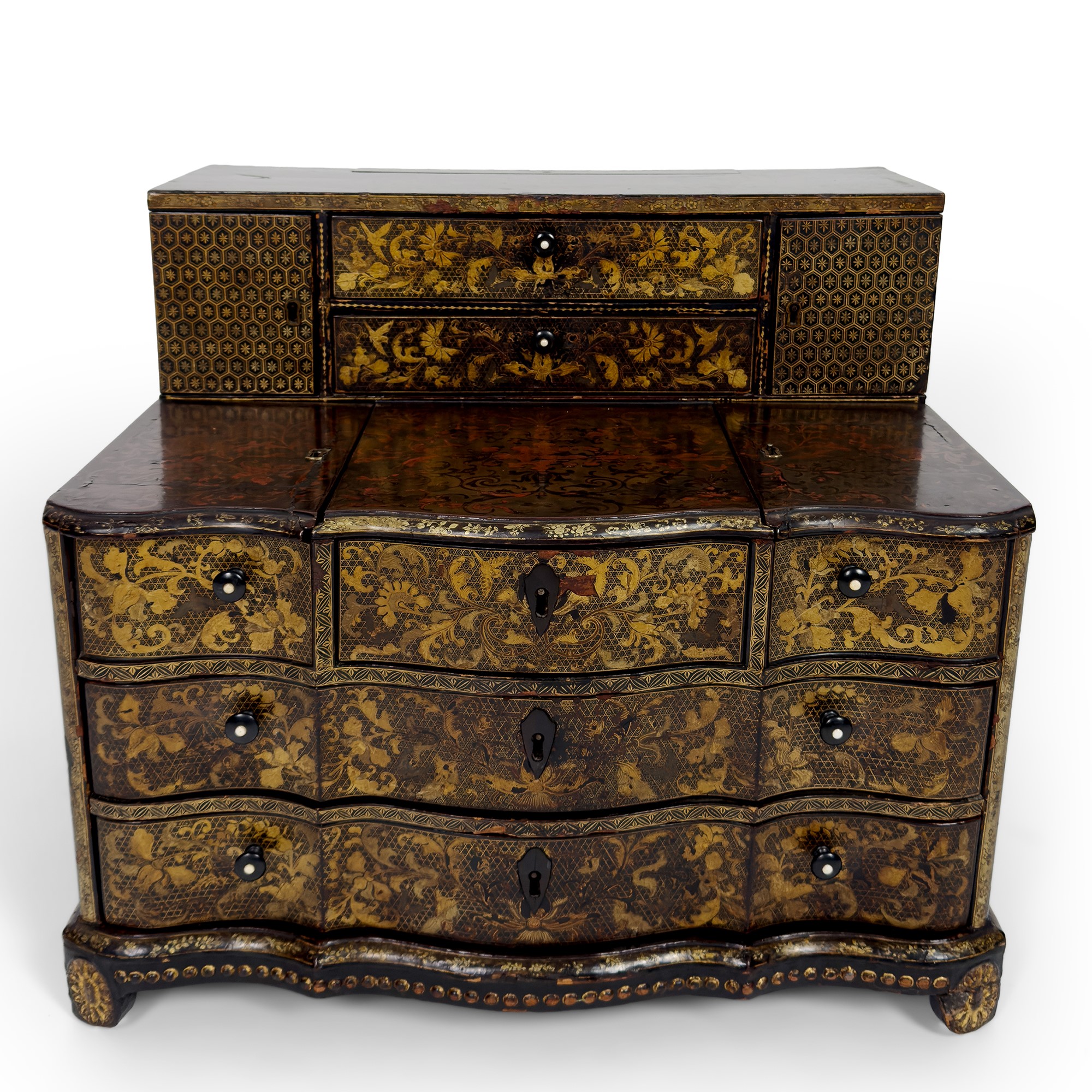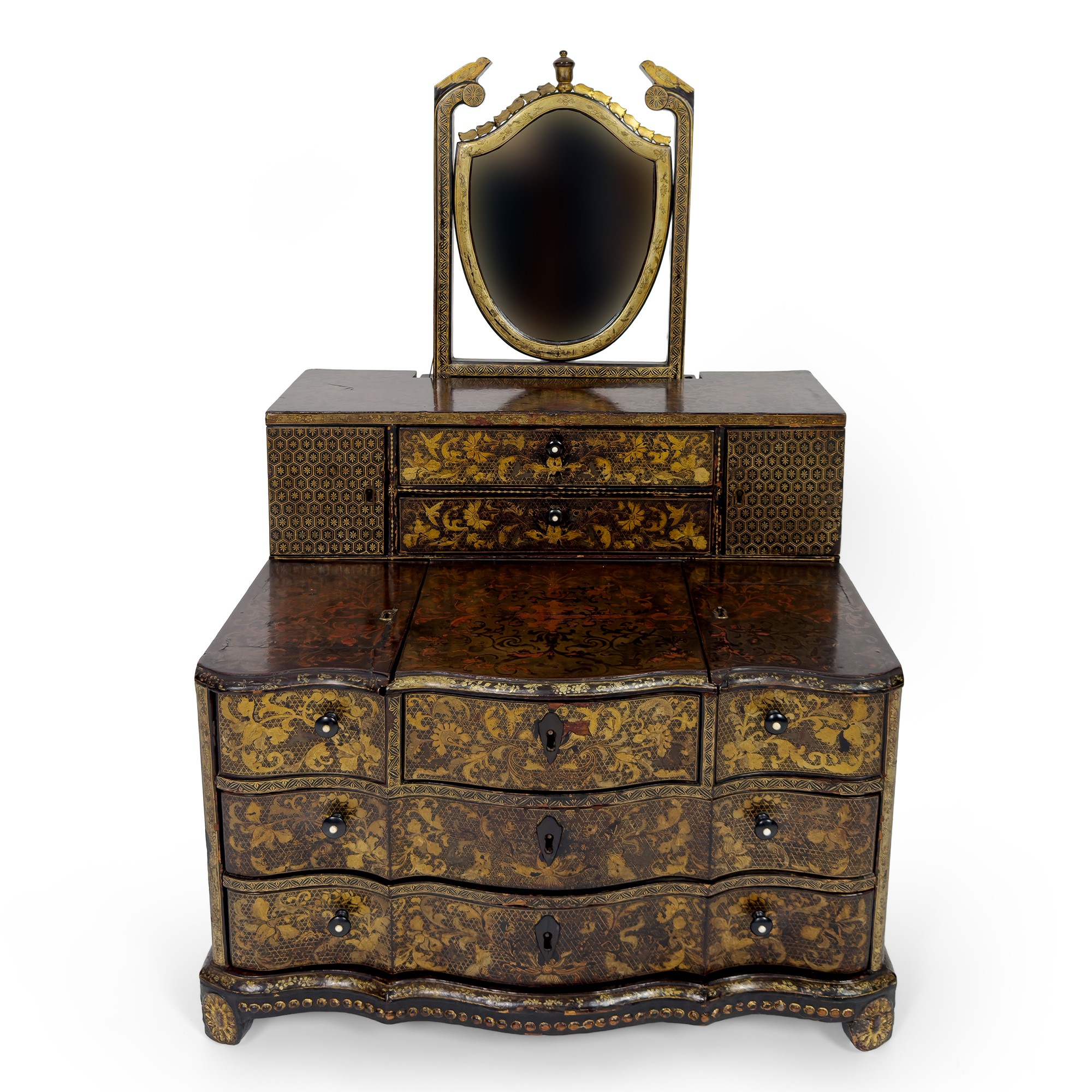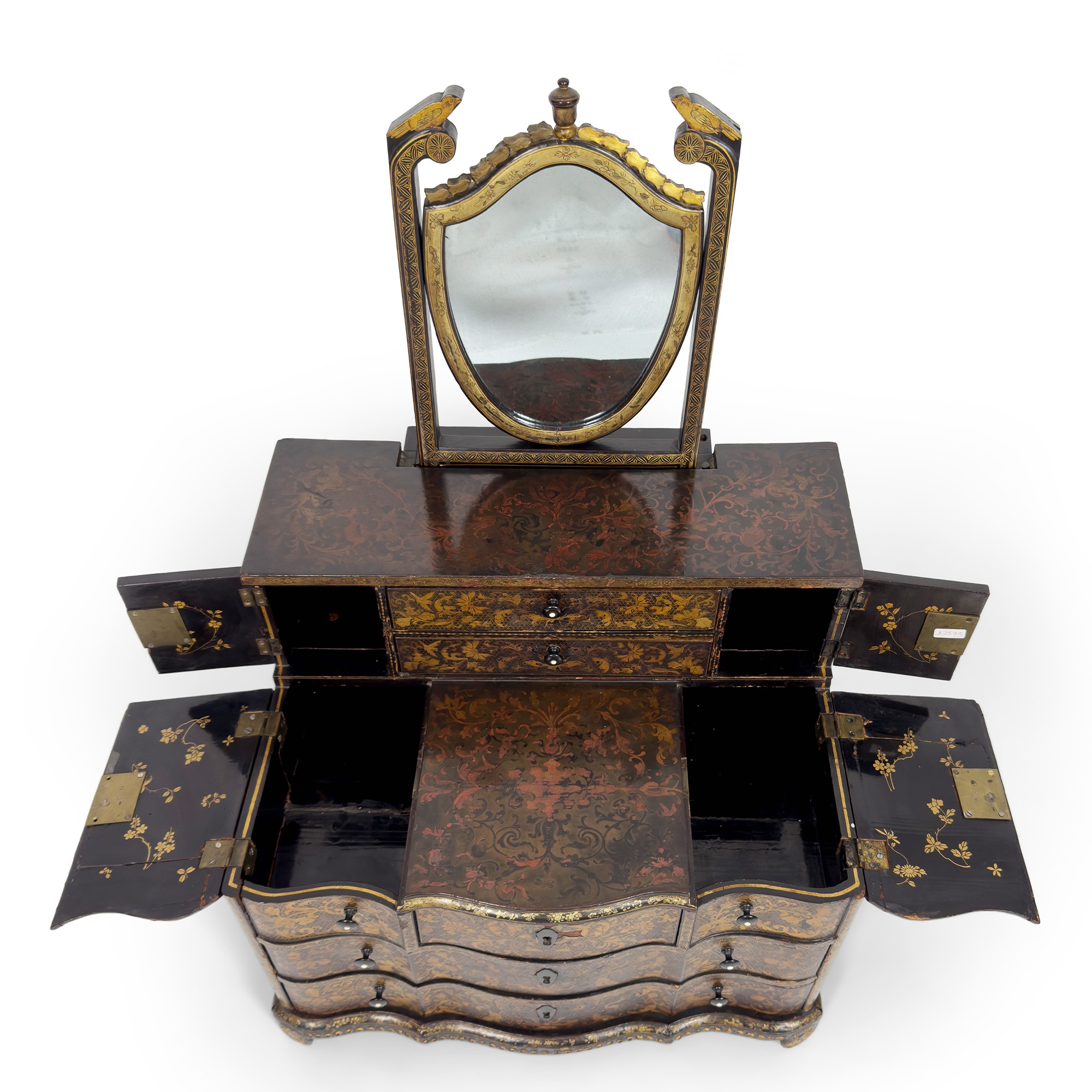 decorated with gilt chinoiseries. Front with three serpentine drawers surmounted by a small cabinet with doors and two central column drawers; from the top, decorated in the manner of Boulle, a small concealed mirror lifts up, 47x43x58 cm (minor defects)