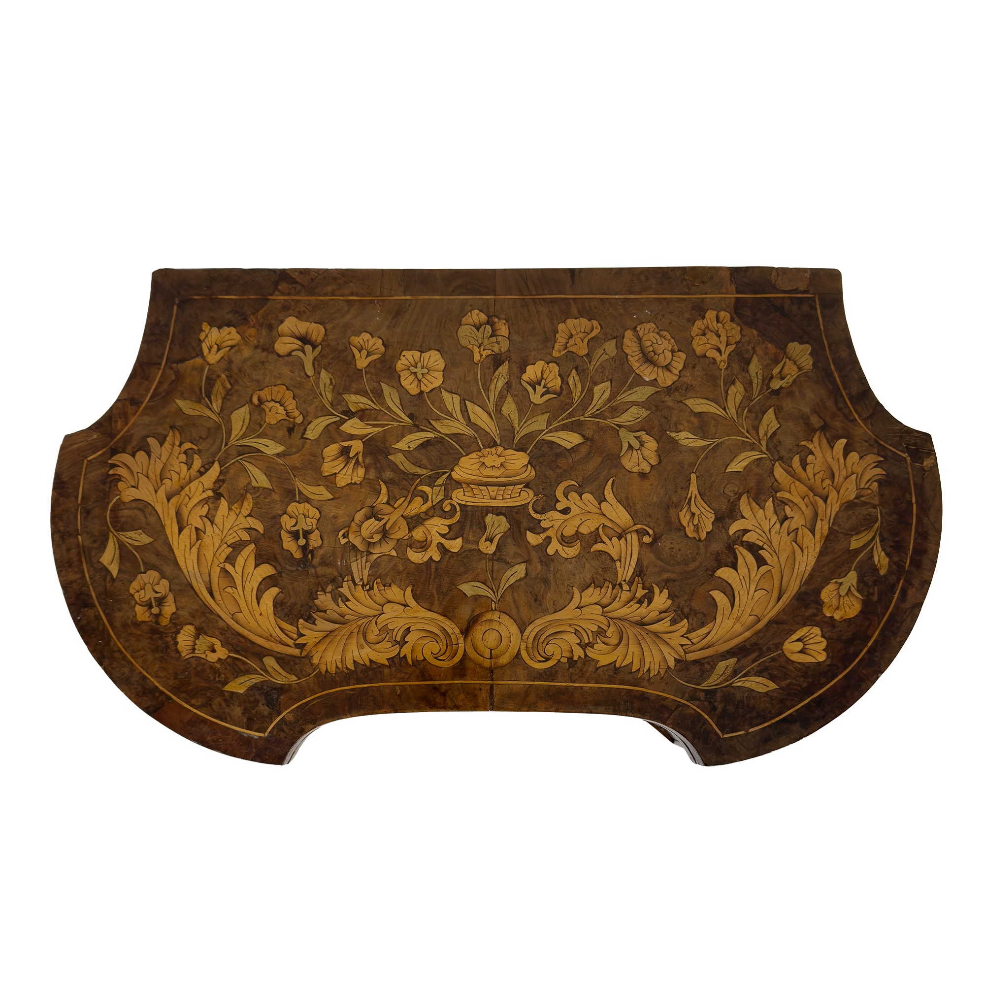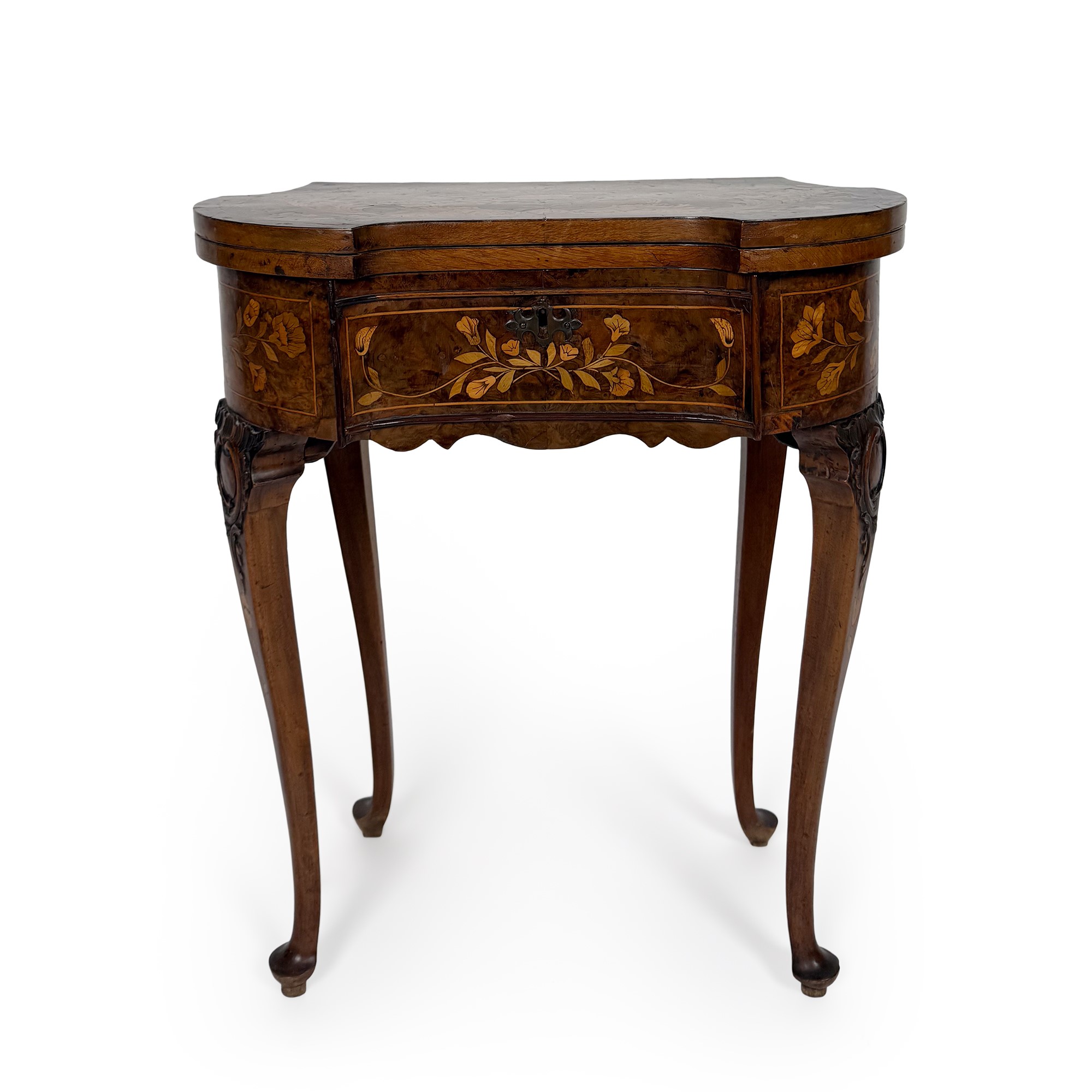 entirely inlaid with fine woods in floral and foliate motifs; top with a mixtilinear profile opening as a book; one drawer in the frieze, 72x60x34 cm (minor defects)