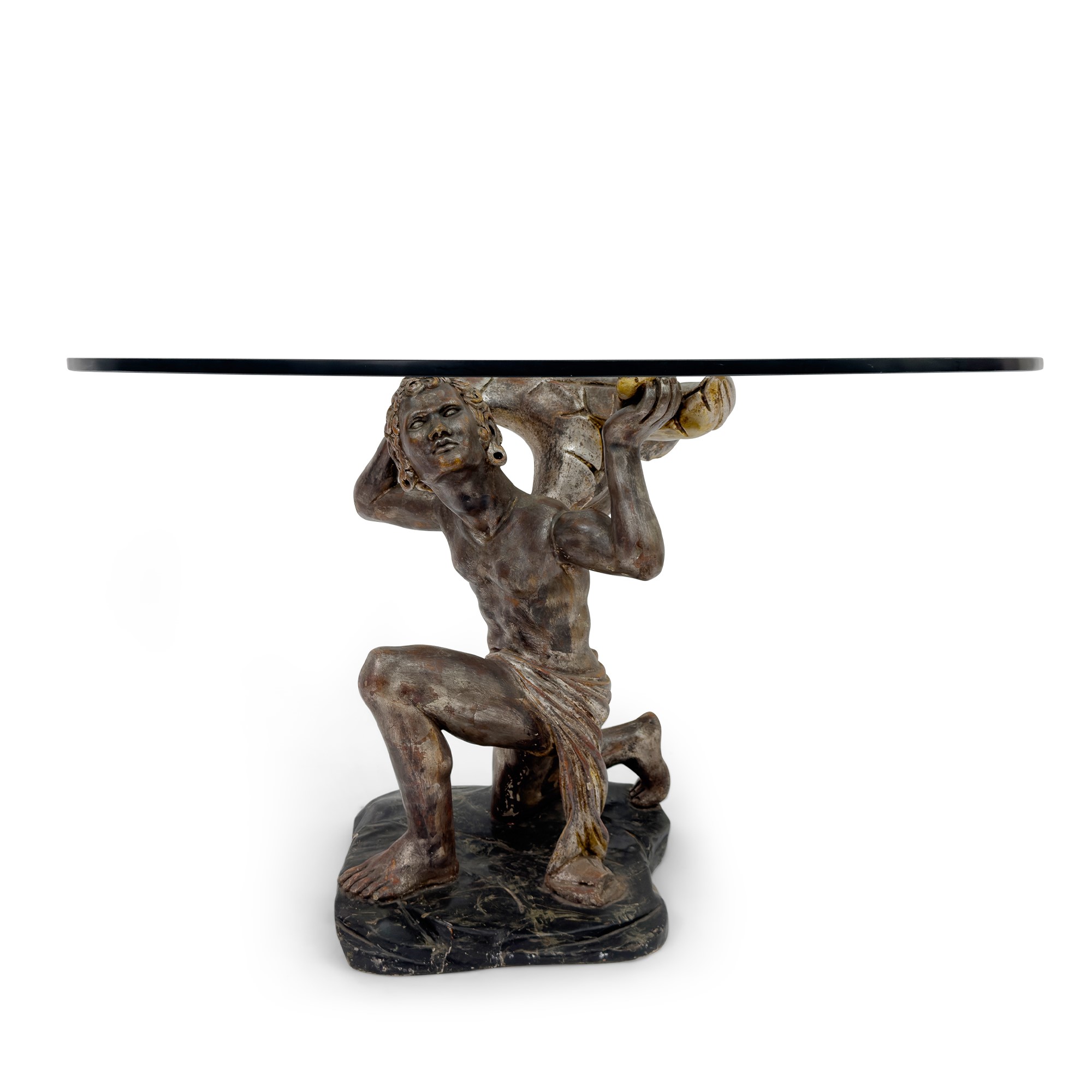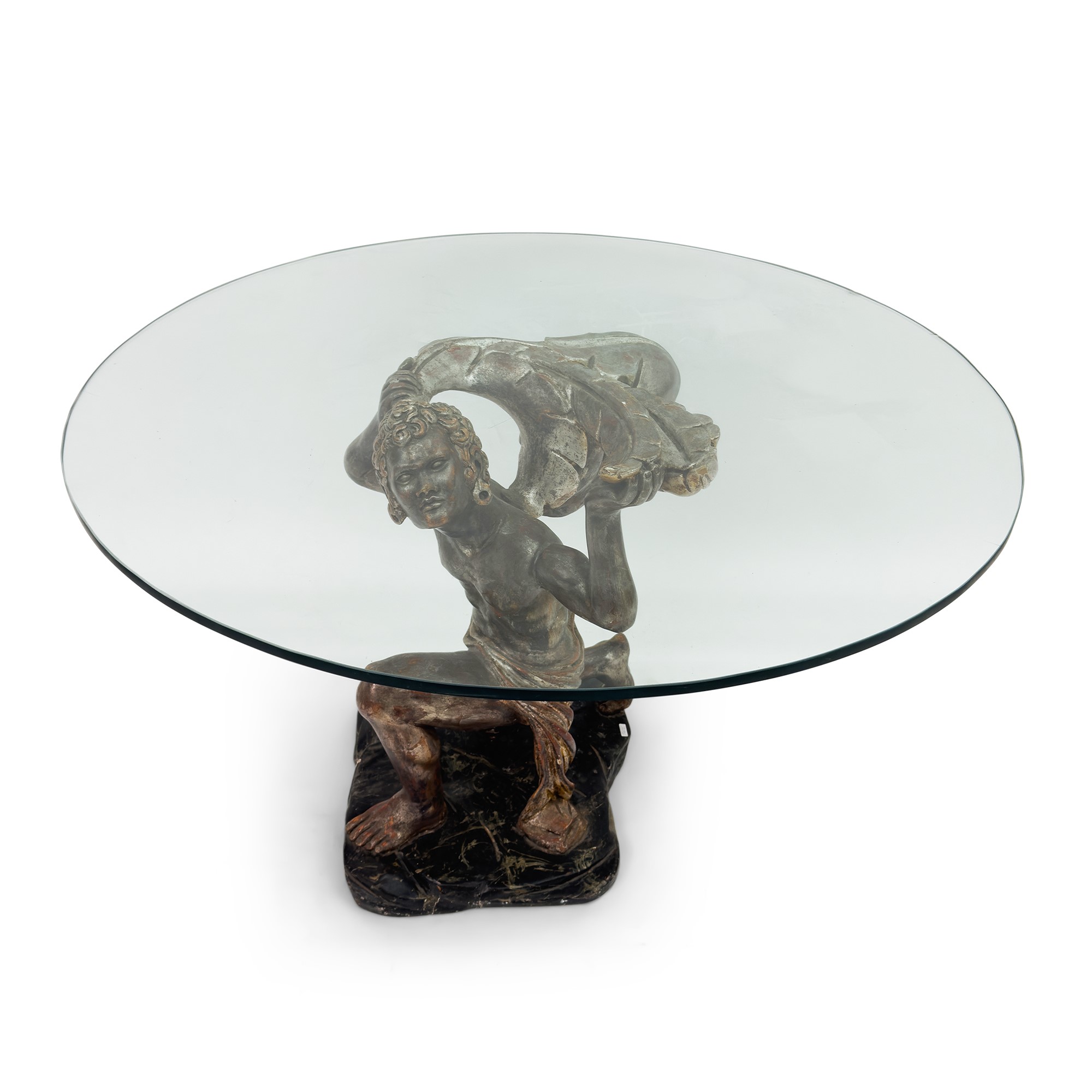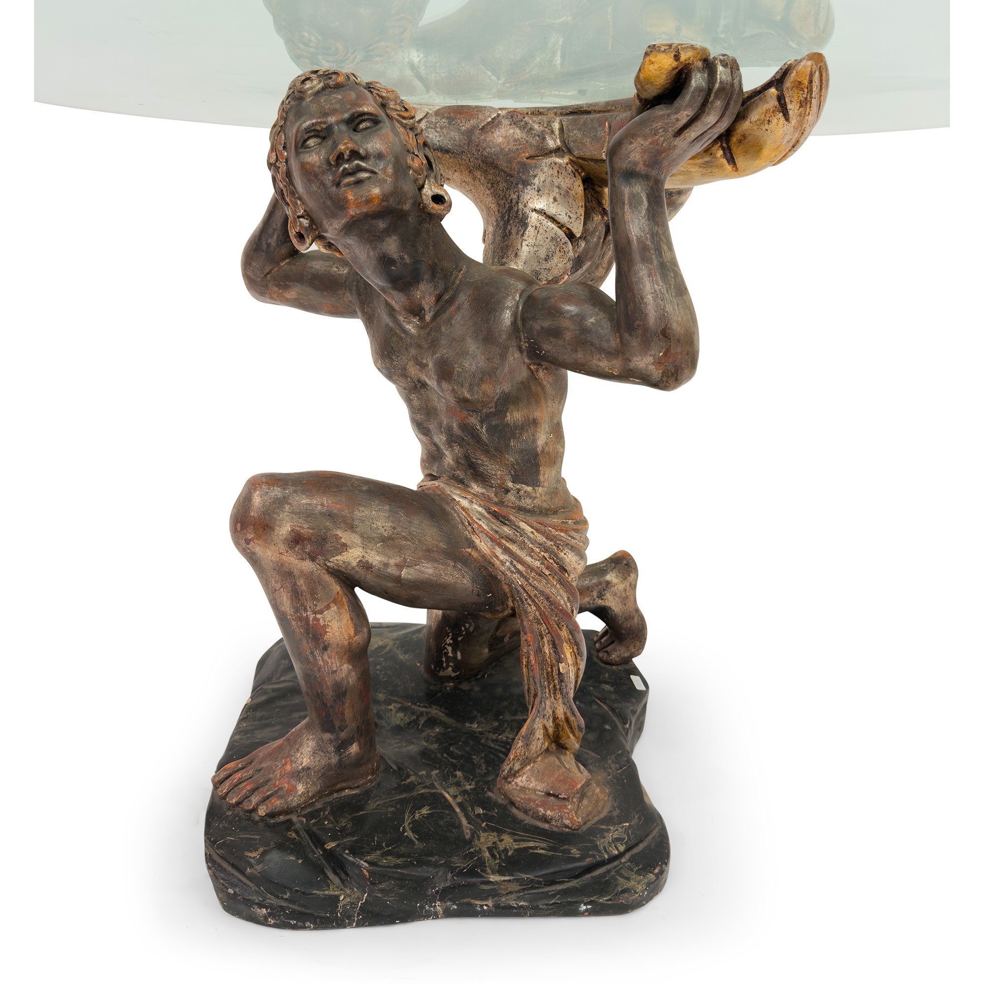 support in silvered and gilt wood carved as a kneeling Moor figure, 75 x 122 cm (chips to the edge of the top)