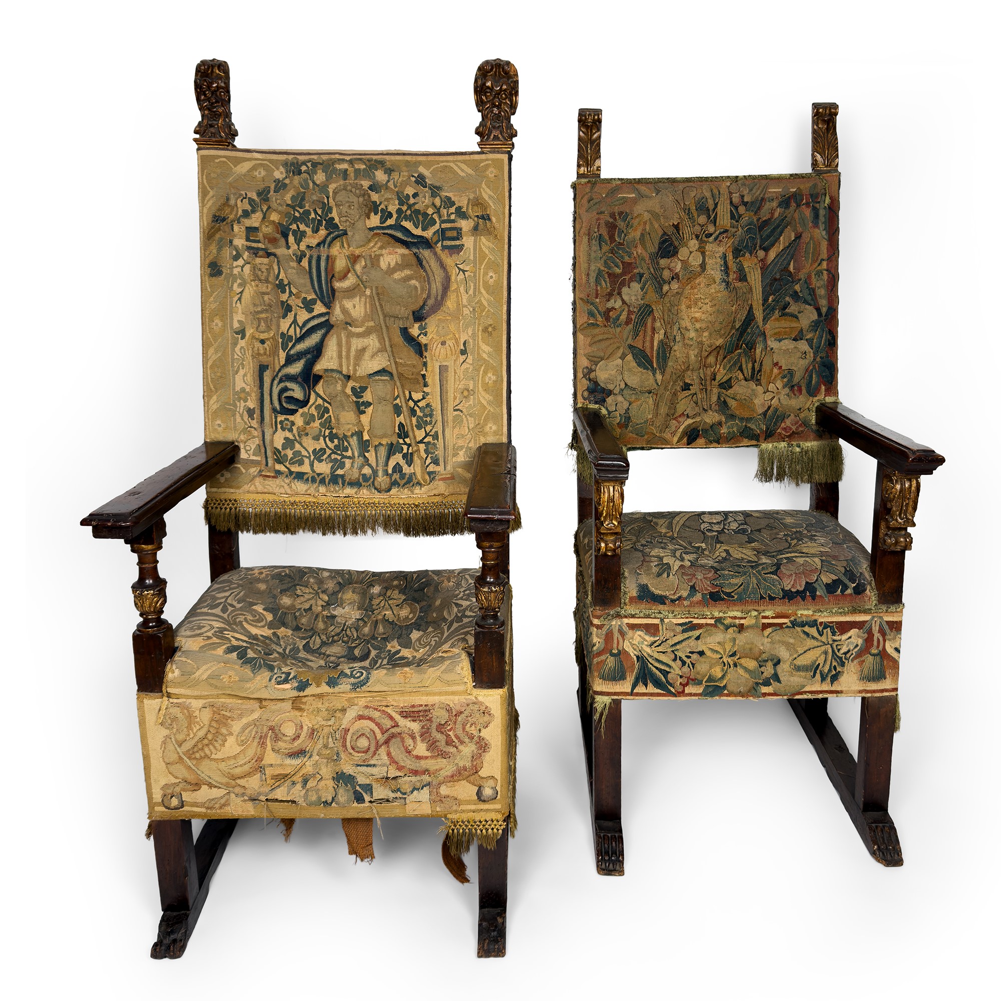 with carved and gilded details; upholstered in contemporary Aubusson fabric. Dimensions: 161×68×61 cm; 156×65×73 cm (defects)
